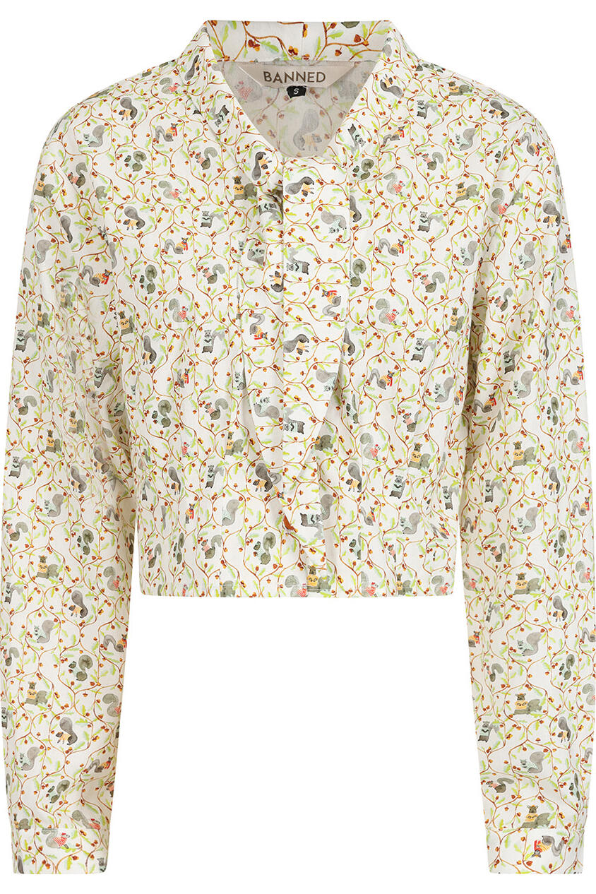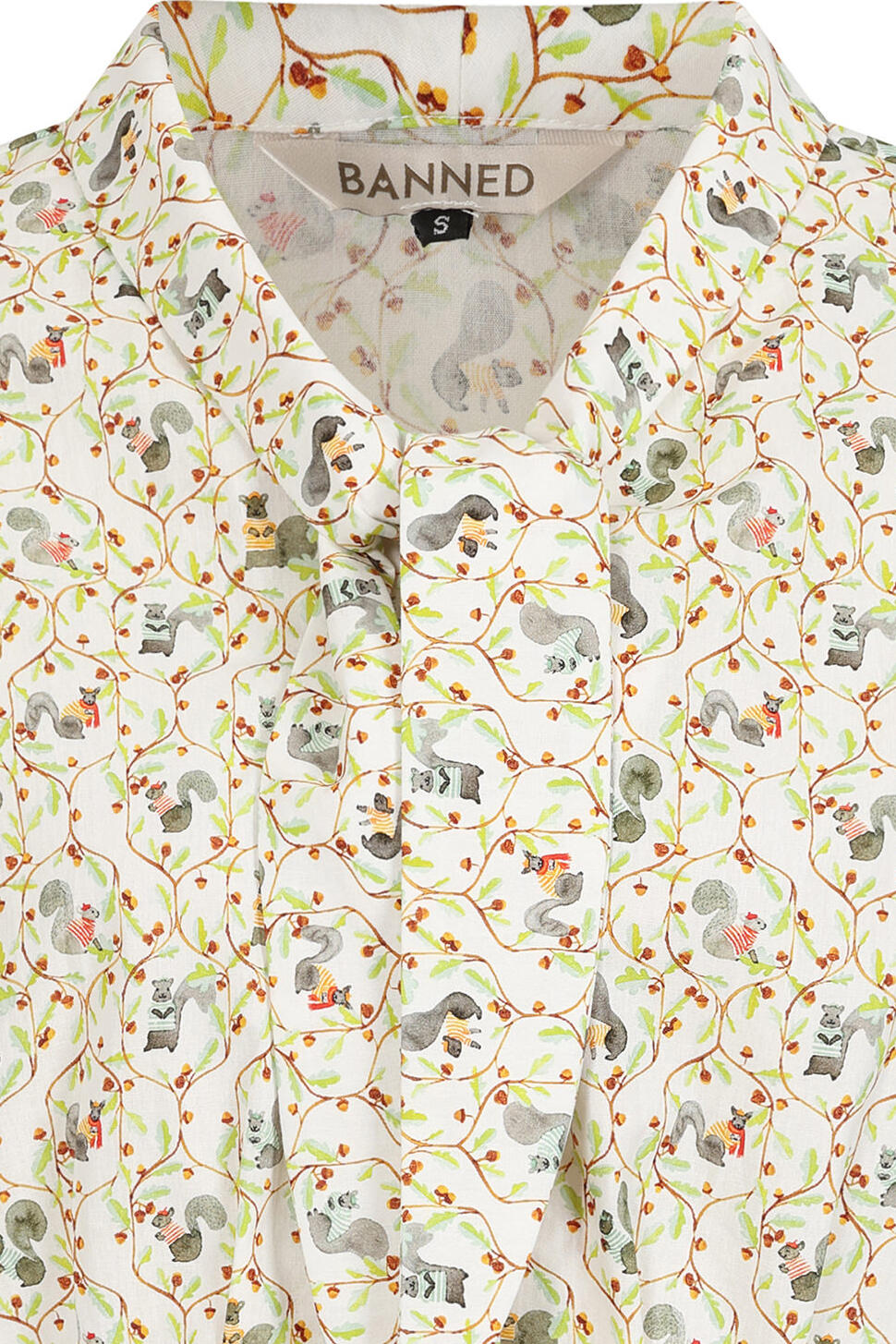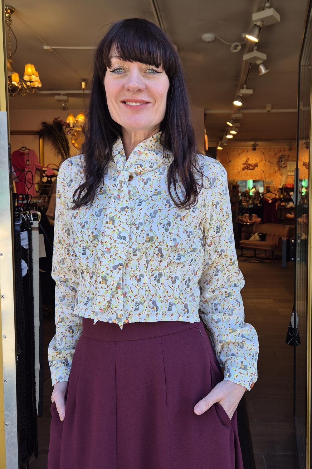 Søt 50-talls inspirert bluse med lekent print av ekorn og kongler. Kort modell, perfekt for high waist. Lett innsvinget fasong, innsydde prinsessømmer som gir flott passform, og knytesløyfe eller slips om du vil i halsen (har en hendig loop du kan tre den i), og lange ermer. Like fin til bukser som skjørt.