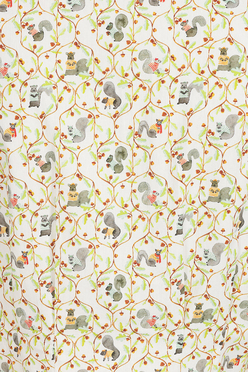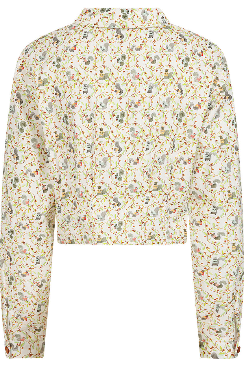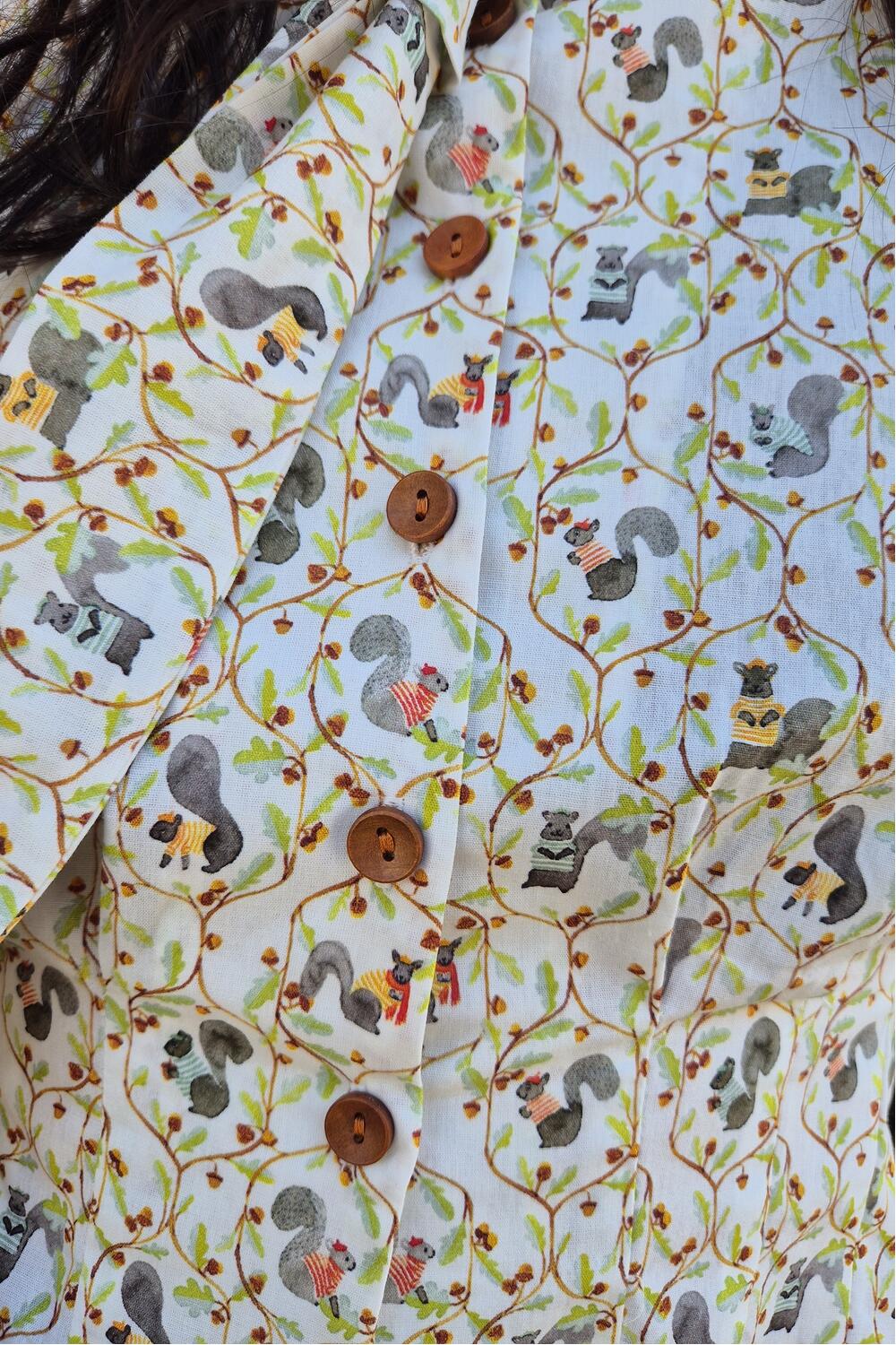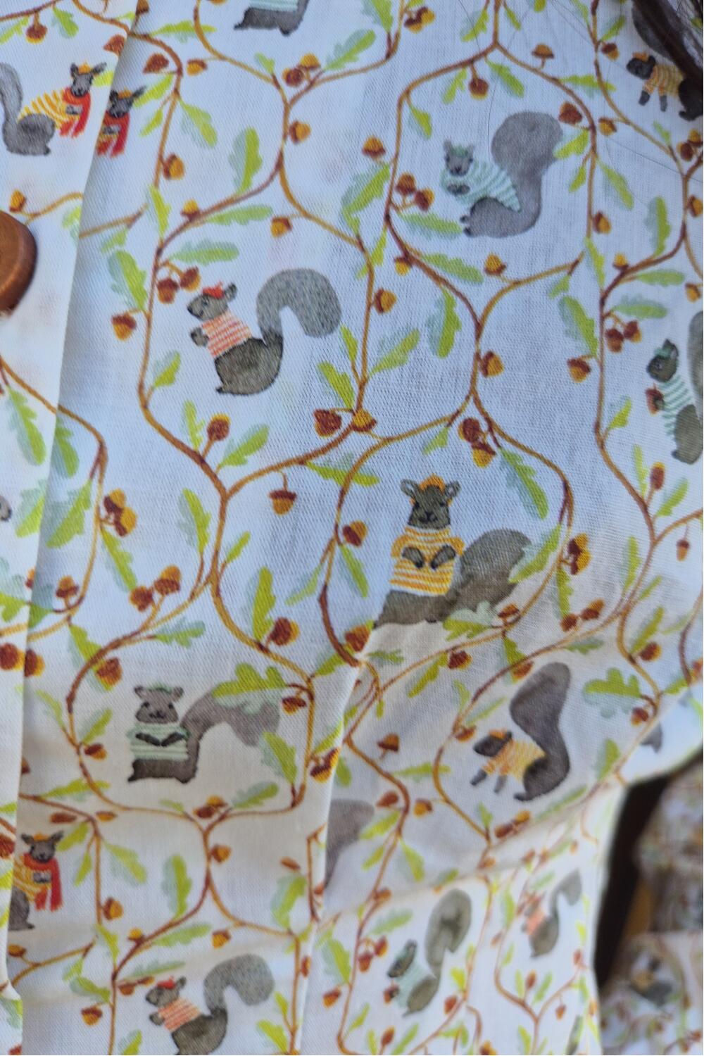 Søt 50-talls inspirert bluse med lekent print av ekorn og kongler. Kort modell, perfekt for high waist. Lett innsvinget fasong, innsydde prinsessømmer som gir flott passform, og knytesløyfe eller slips om du vil i halsen (har en hendig loop du kan tre den i), og lange ermer. Like fin til bukser som skjørt.