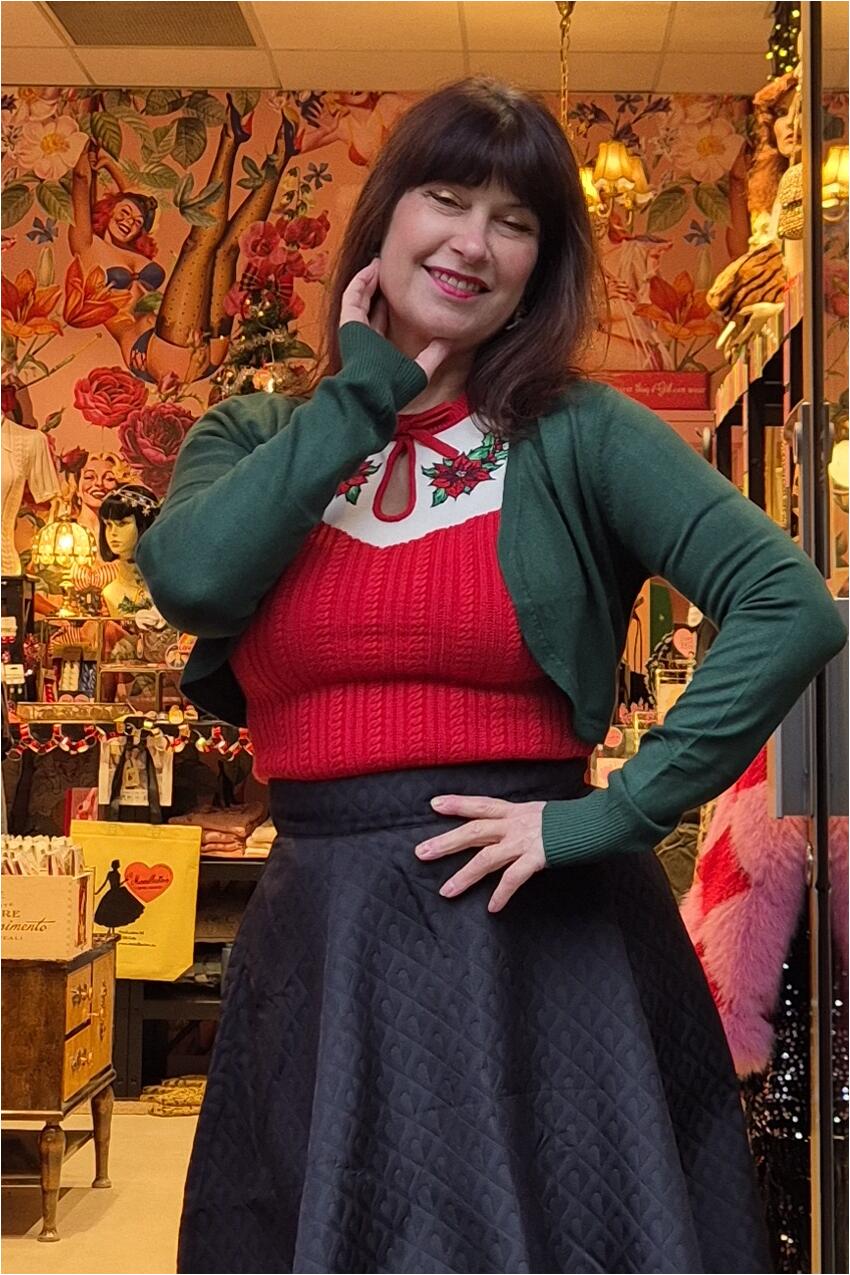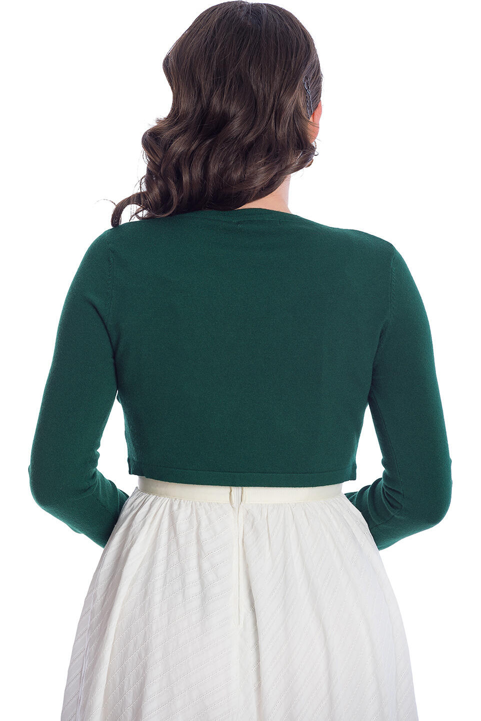 Flaskegrønn strikket bolero med lage ermer. Perfekt når du trenger å dekke ermene, også varmer den litt ekstra om du trenger. Åpen modell, så her kan antrekket du har på skinne.