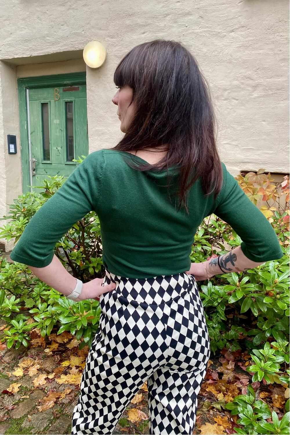 Vintageinspirert genser! Tenk Marilyn Monroe og Brigitte Bardot Vi presenterer den nye favorittgenseren din! Supermyk, komfortabel strikket genser med båthals. Tre kvart ermer med v-åpning og søt sløyfedetalj.