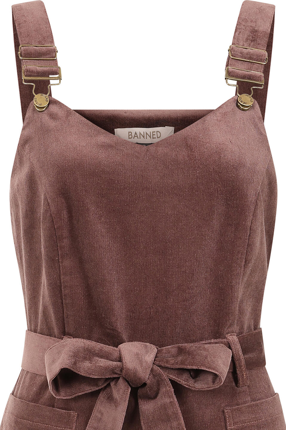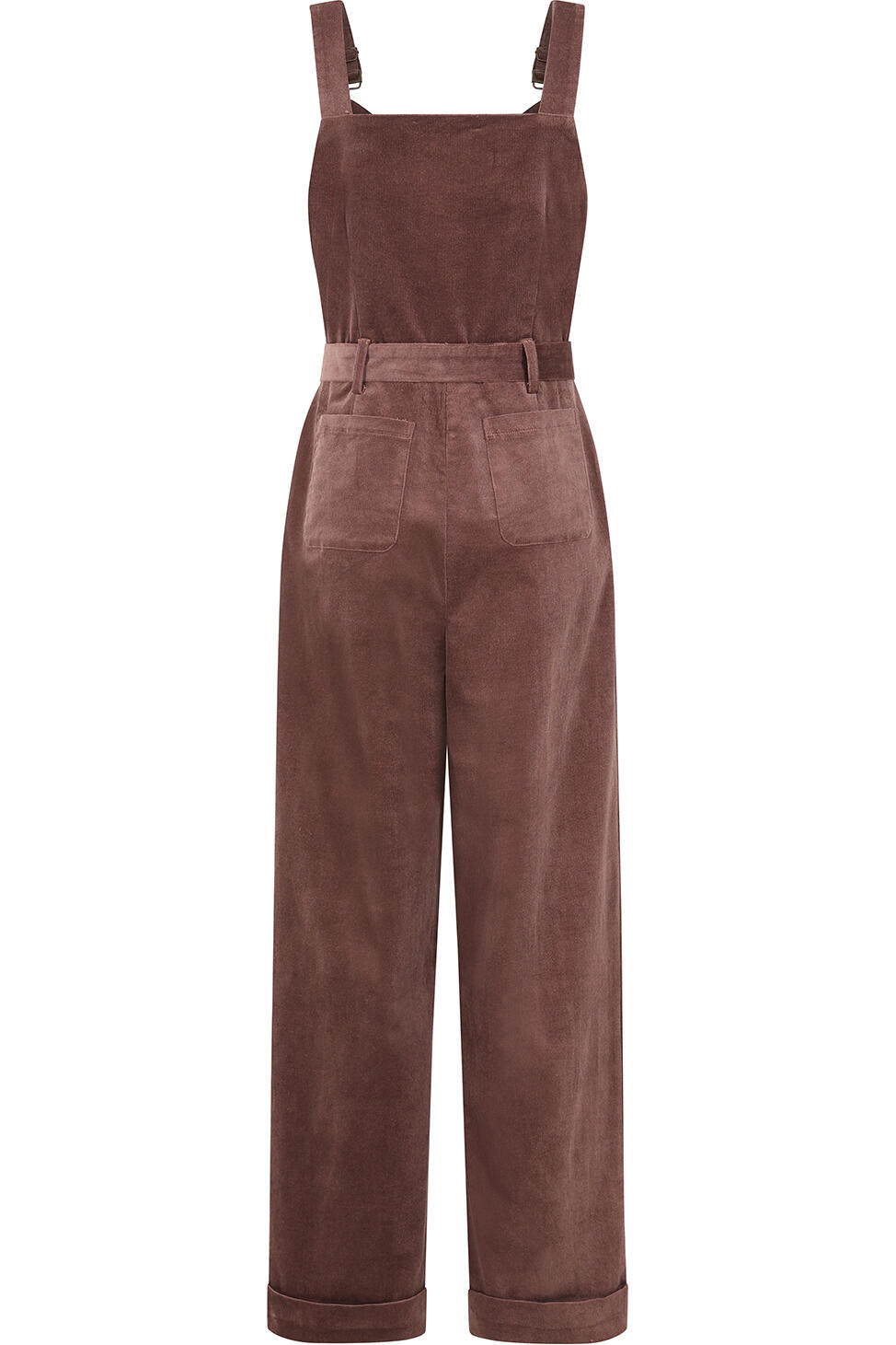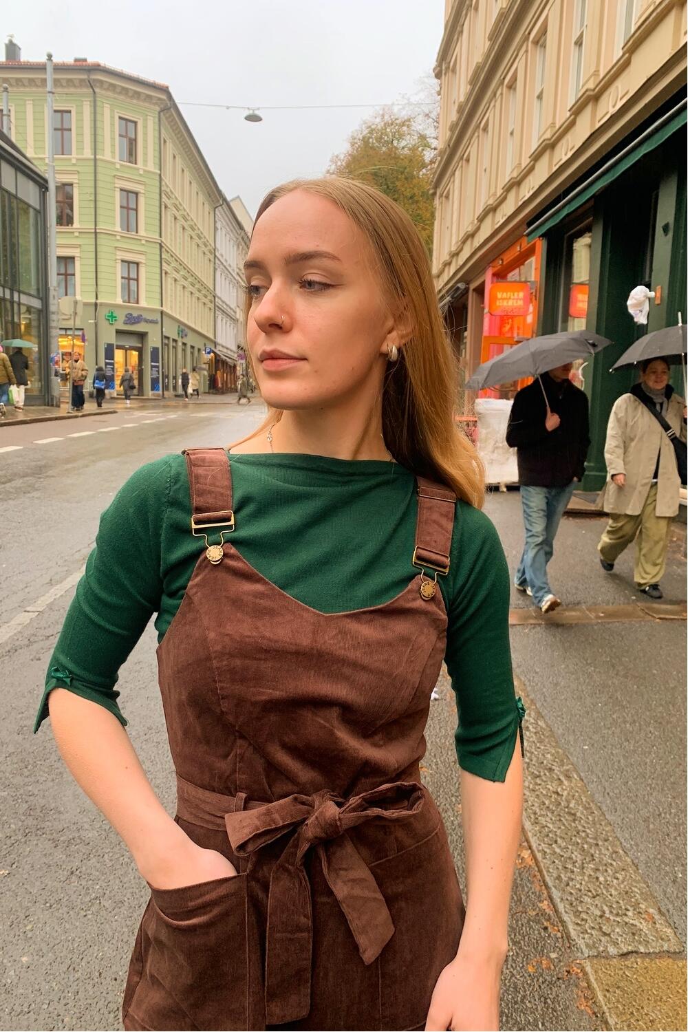 Harriet er jumpsuiten som har inspirasjon fra 1950-tallet, men er superaktuell nå. I deilig brun kordfløyel. Hun har en overdel med brede, justerbare skulderstropper og bred v-hals. Knytebelte for å snurpe inn midjen, og rette buksebein med lommer foran og bak.