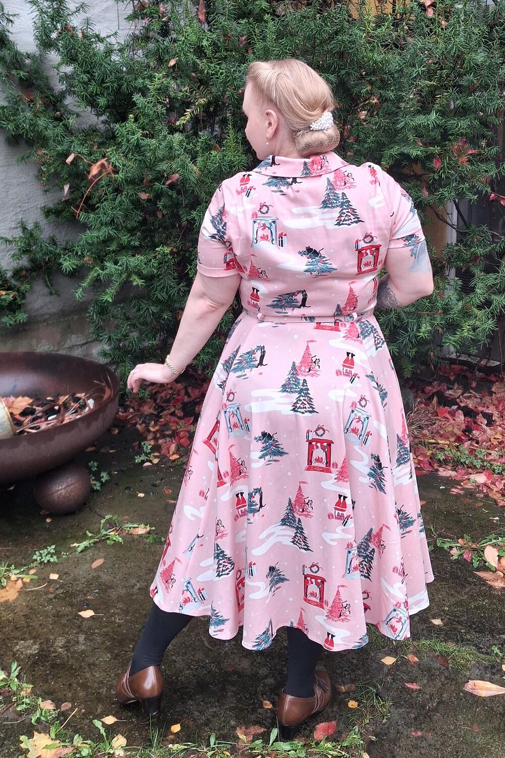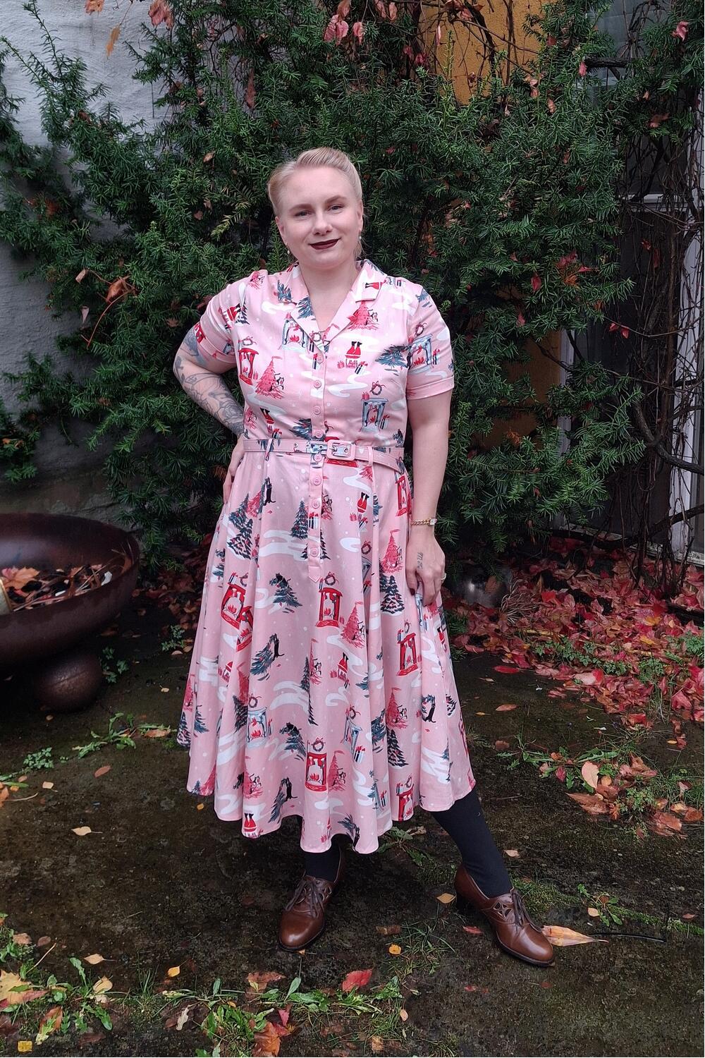 Bella er en skjortekjole i et lekent juleprint med katter og juletrær! Med sin tidløse form blir Bella en stjerne i garderoben din.