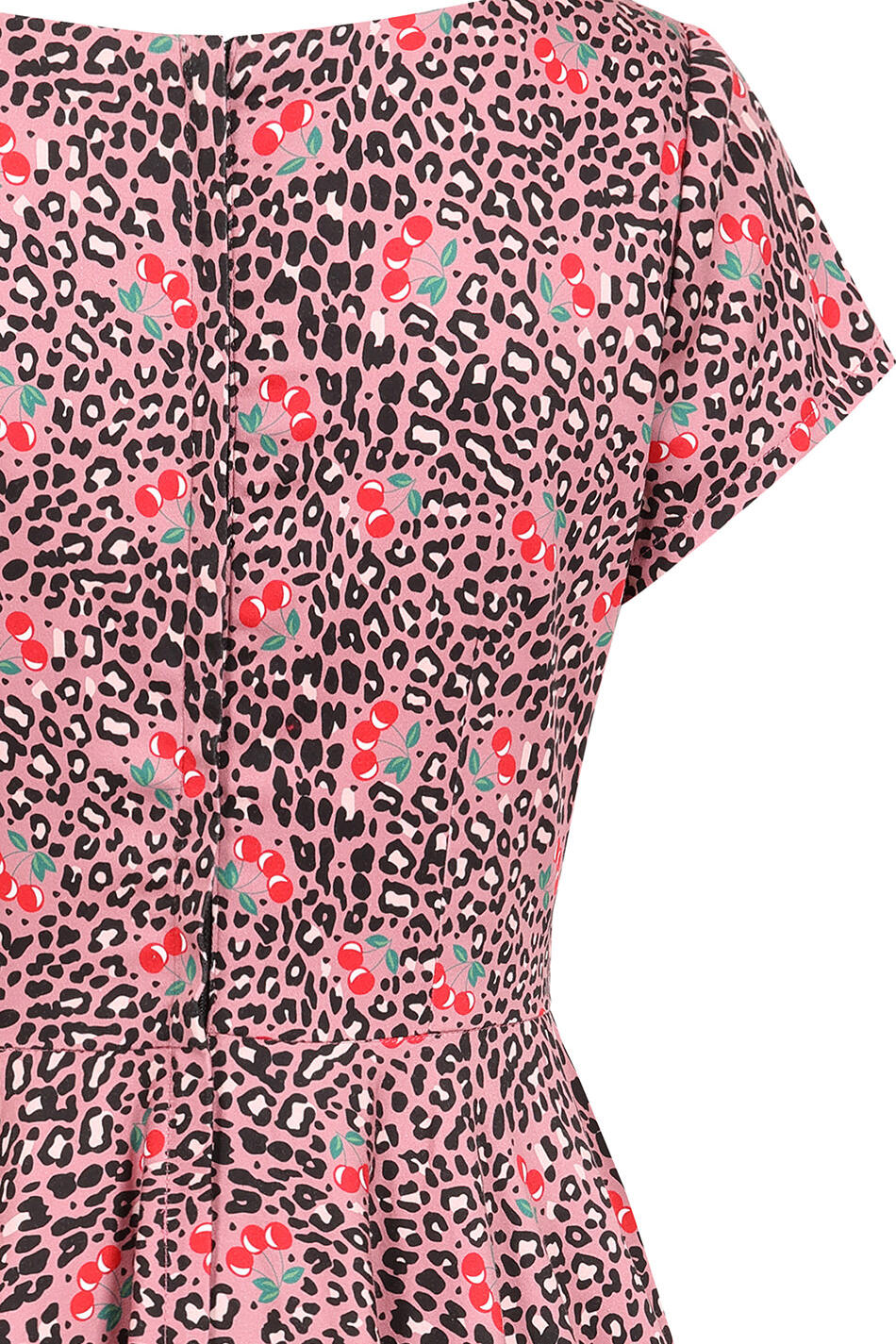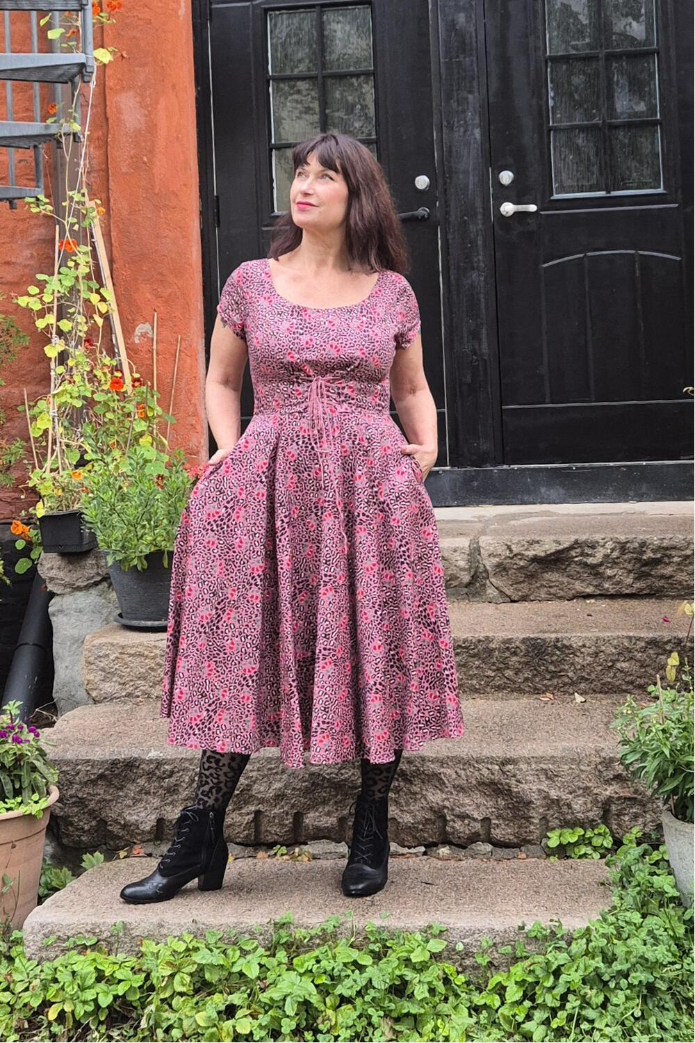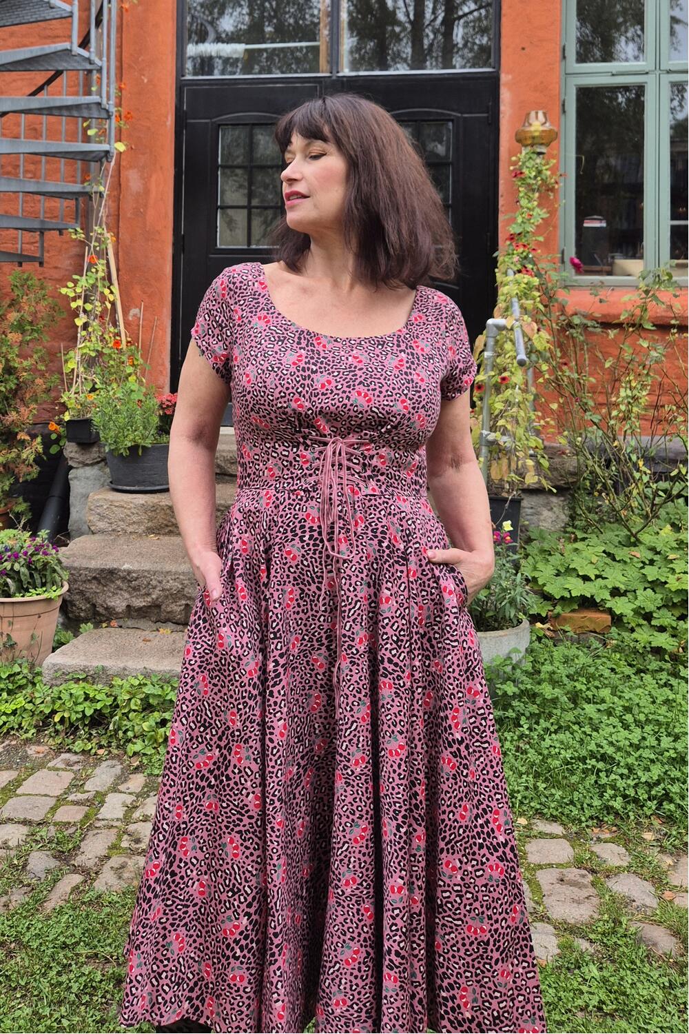 Lola er en purrfekt swingkjole med et lekent leopardprint drysset med kirsebær. En perfekt mix av rocka og retro! I myk og deilig bomullssateng med snøring foran i rosa fløyel. Snakk om en showstopper av en kjole! Denne kan du style til både hverdags og fest, som jo er favorittkjolene våre. Stor, rund hals, korte, vide ermer og et swingskjørt du kan ha tyllskjørt under for ekstra volum. Lommer i sidene.