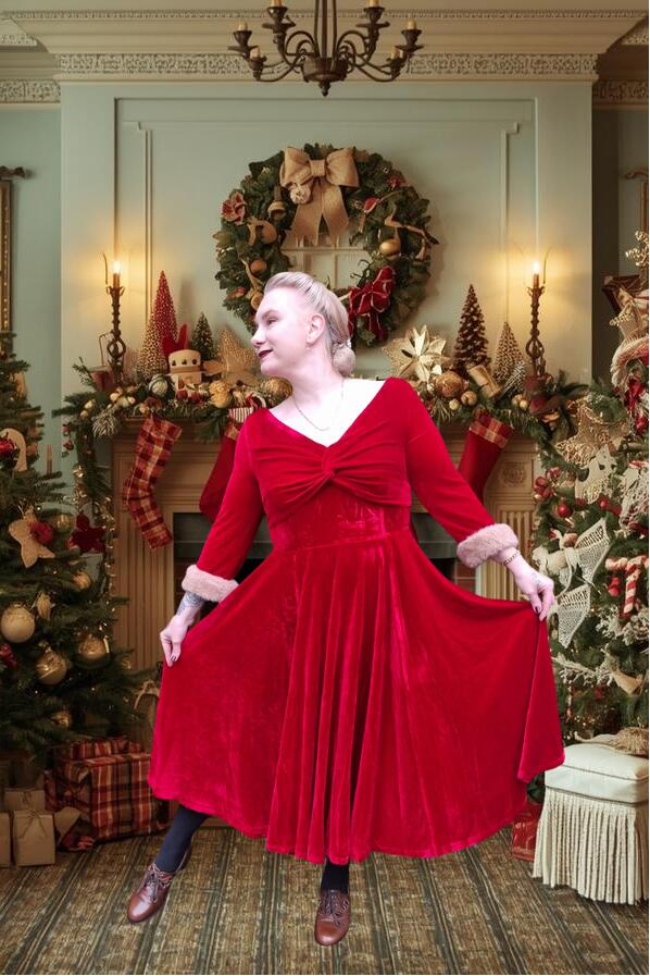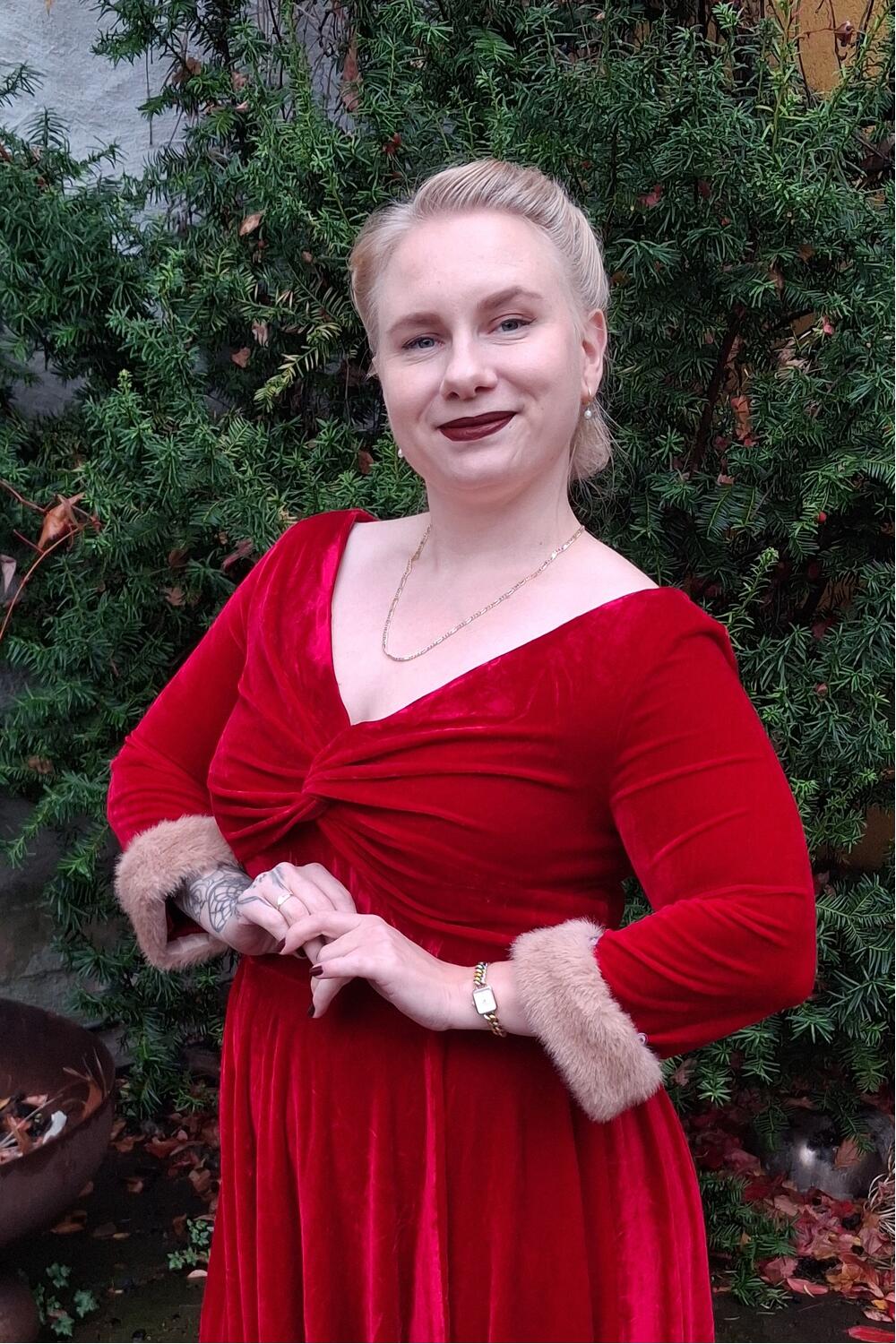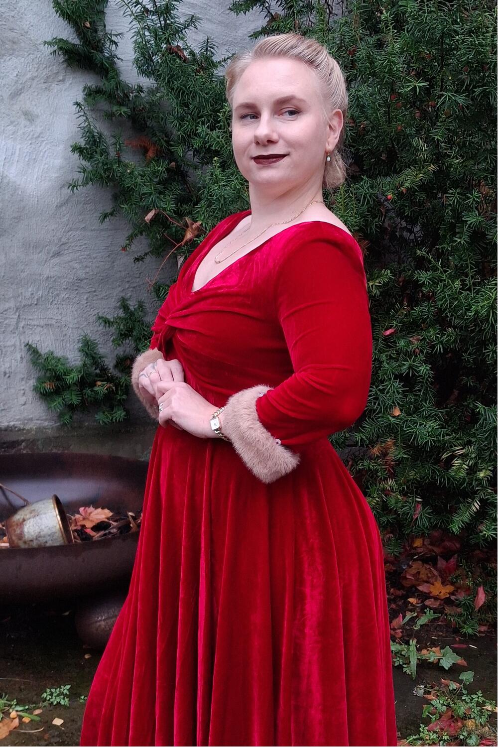 Føl deg som en filmstjerne i denne drømmekjolen. Tidløs festkjole i myk, rød fløyel med kremfarget pels på mansjettene.
