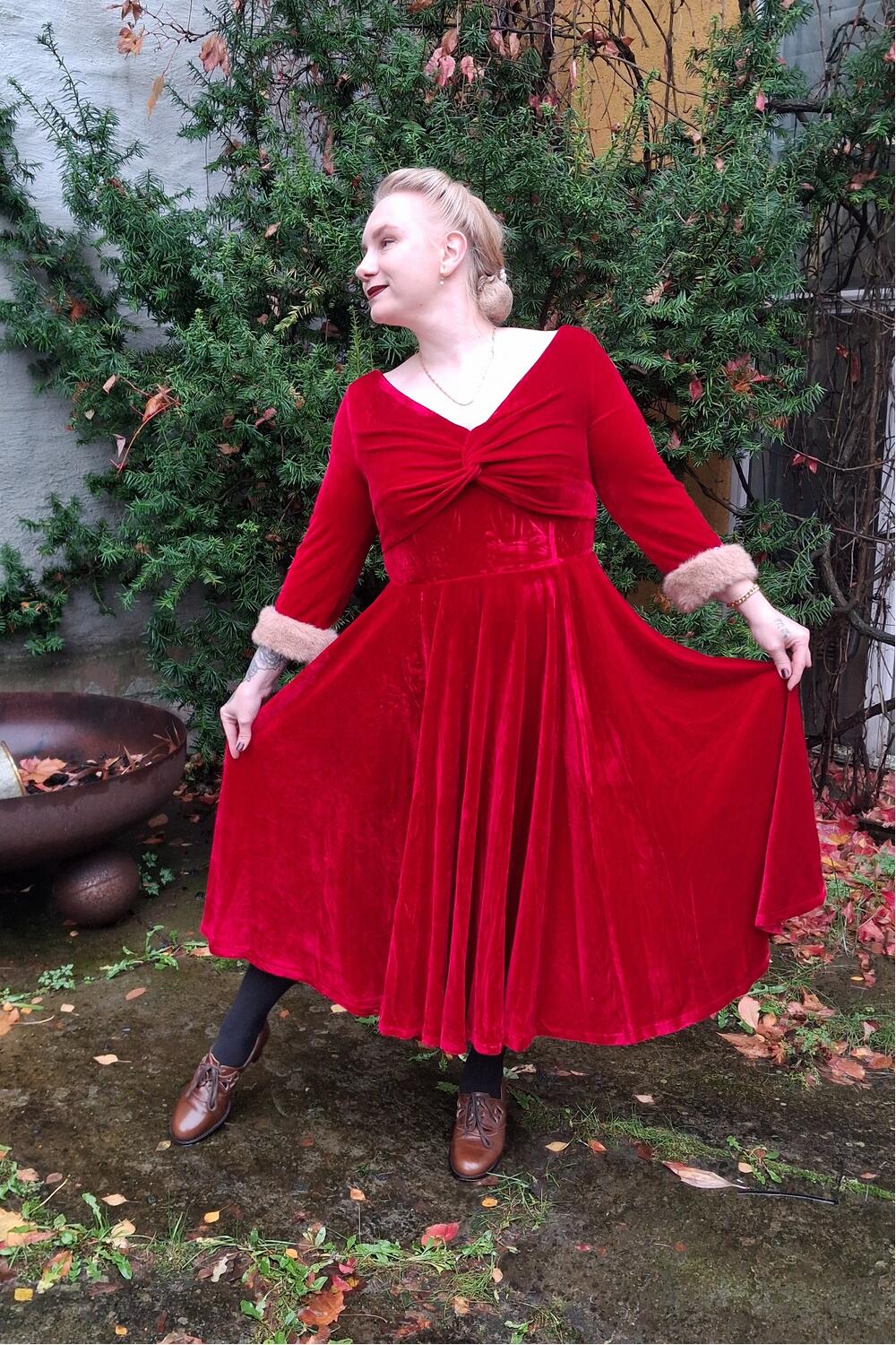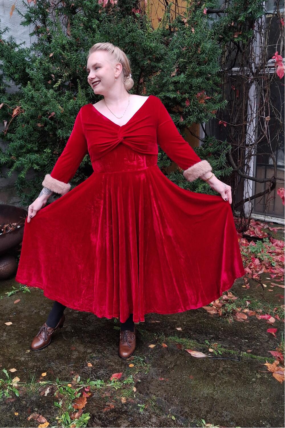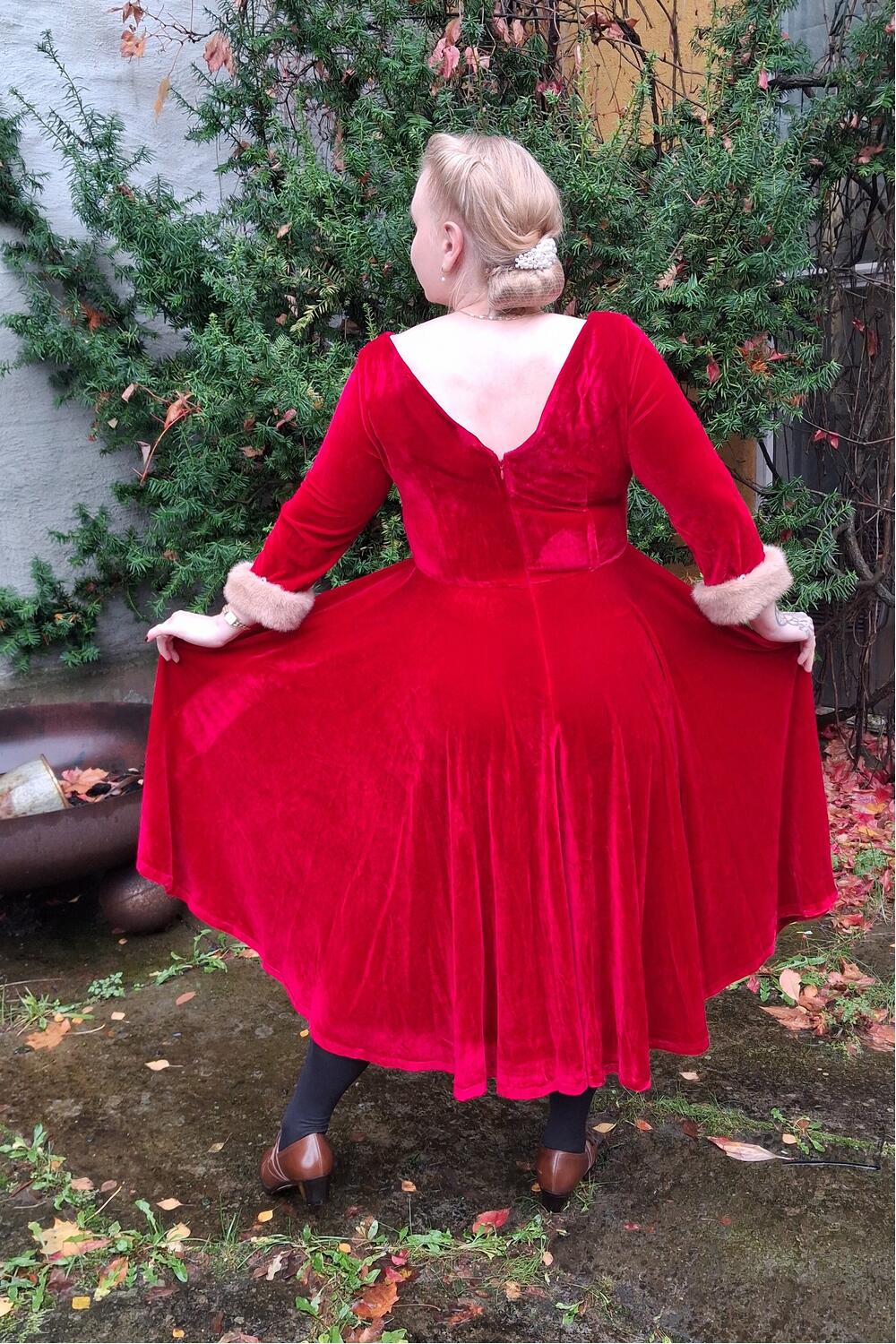 Føl deg som en filmstjerne i denne drømmekjolen. Tidløs festkjole i myk, rød fløyel med kremfarget pels på mansjettene.