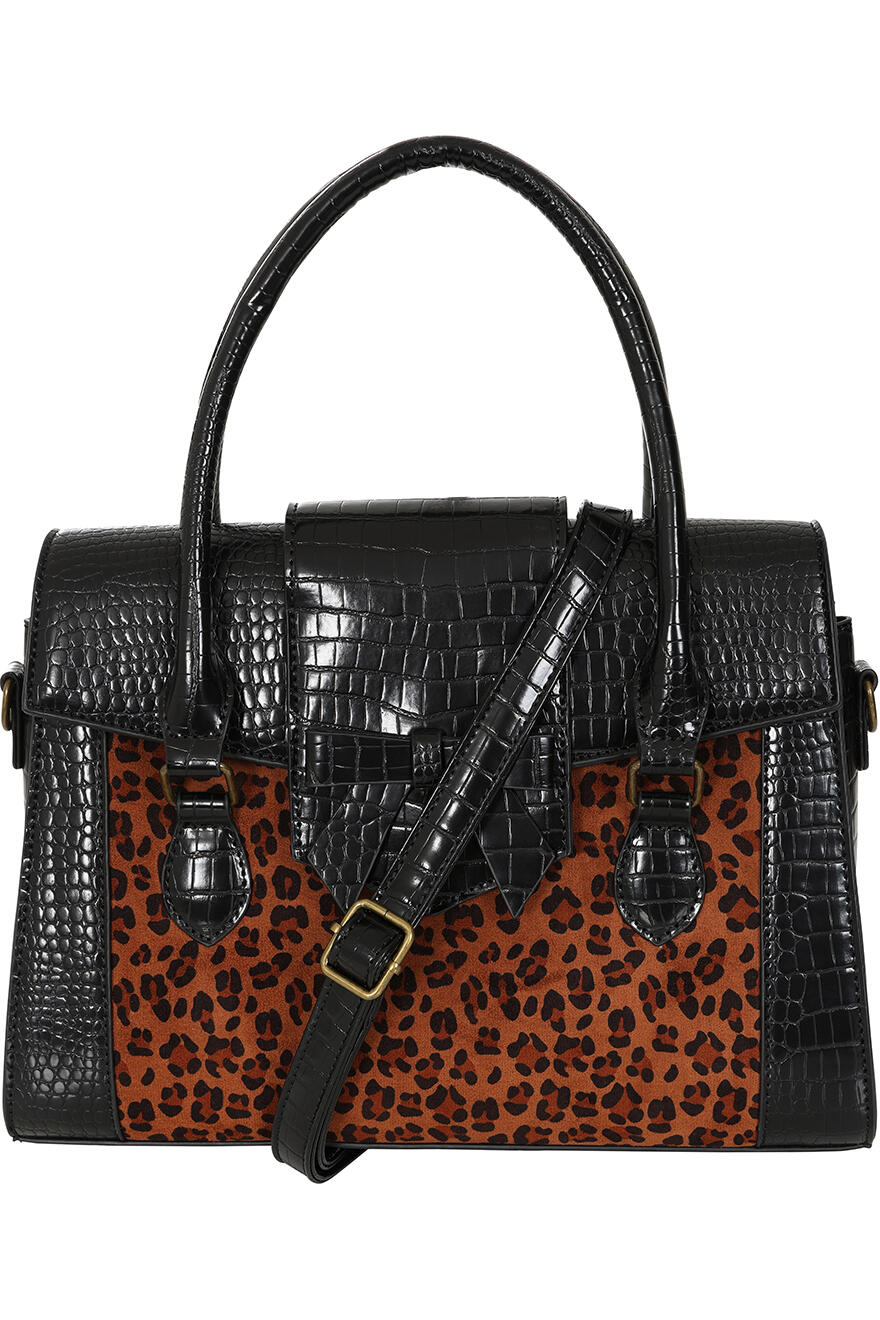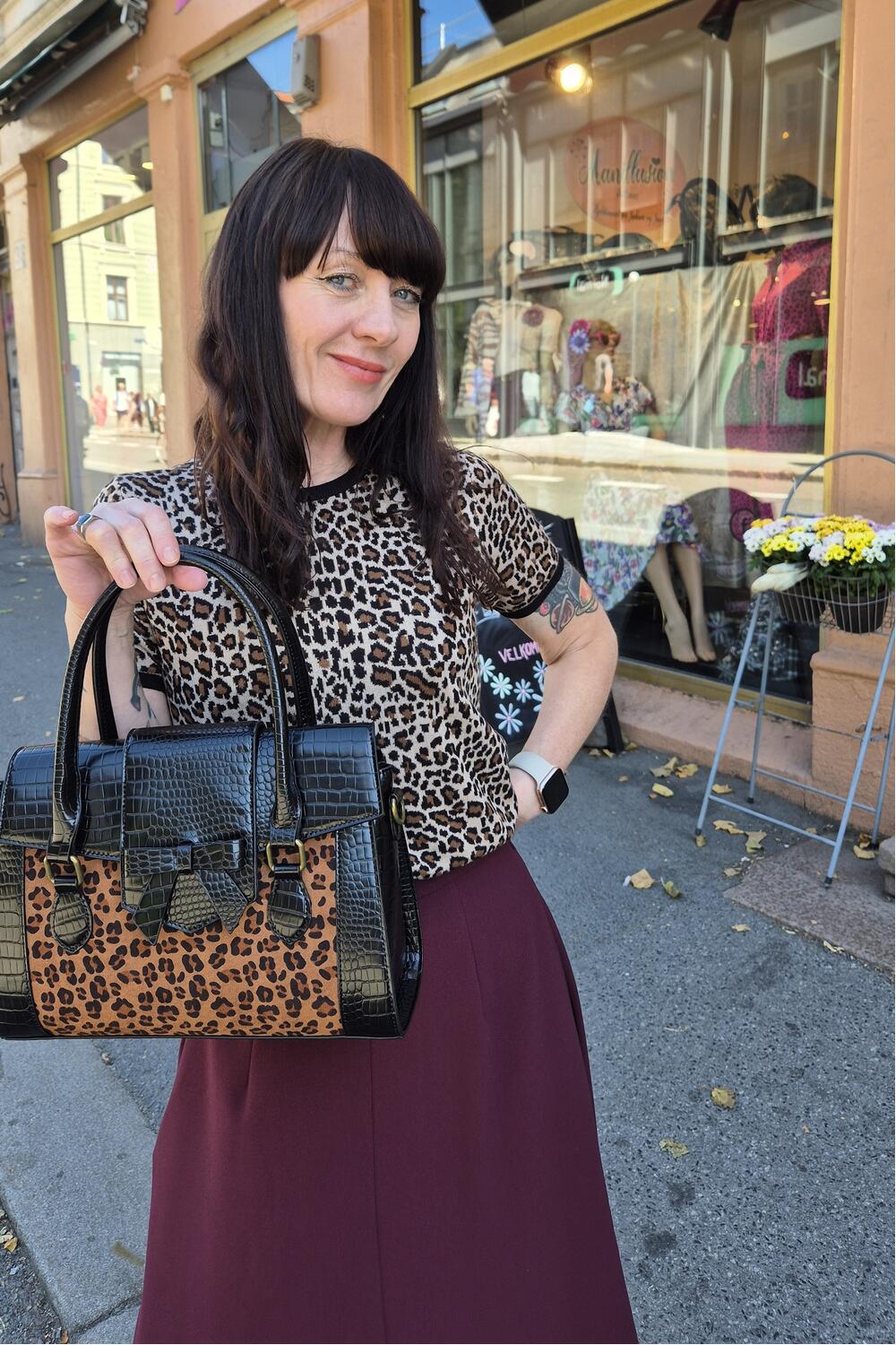 Herlig retro veske i imitert skinn og leopardprint. Vesken har lommer med glidelås både på innsiden og bak på utsiden. Hendig og praktisk. Avtagbar skulderreim følger også med.