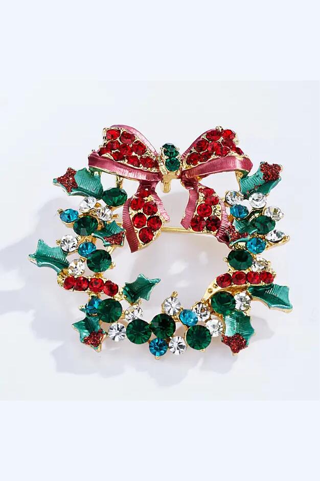 En vakker brosje formet som en julekrans, og pyntet med strass. Vinterens må ha!
