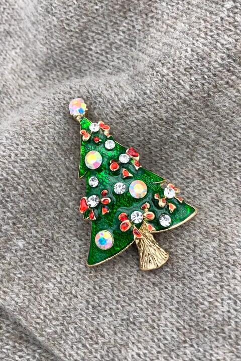 En vakker brosje formet som et juletre, og pyntet med strass og perler. Vinterens må ha!