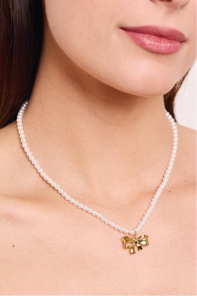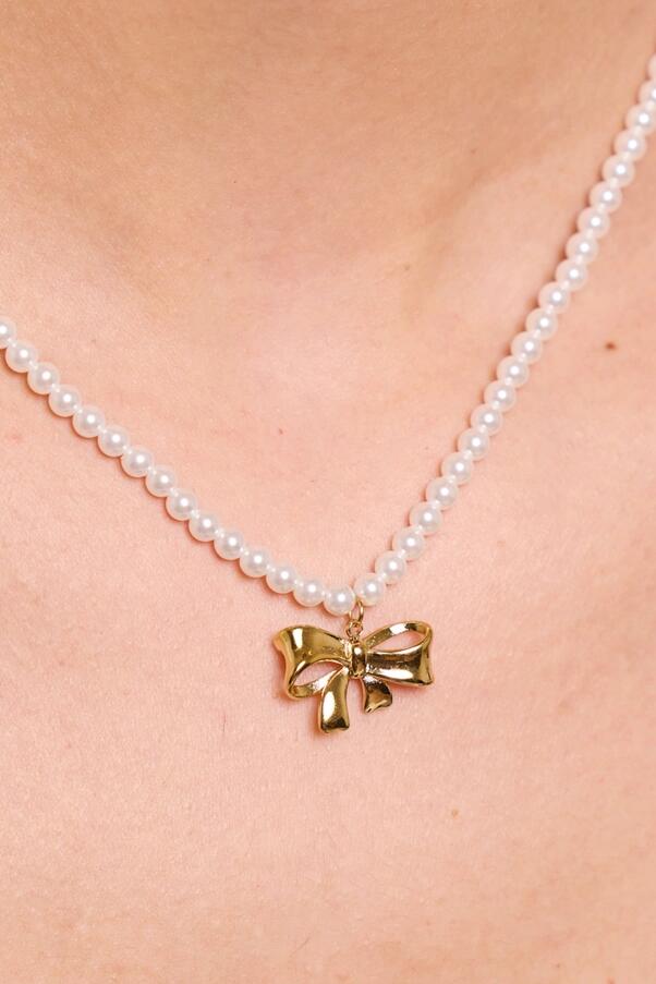 Her et perlekjede med en gullsløyfe. Som en drøm av et smykke.