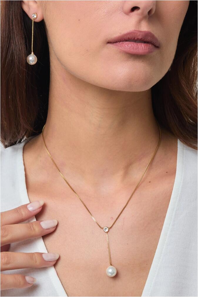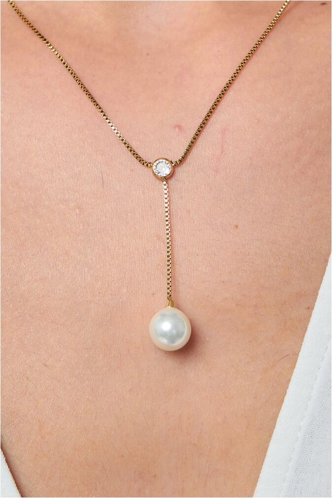 Her et kjede med en strassdiamant og en snor med perle. Som en drøm av et smykke.