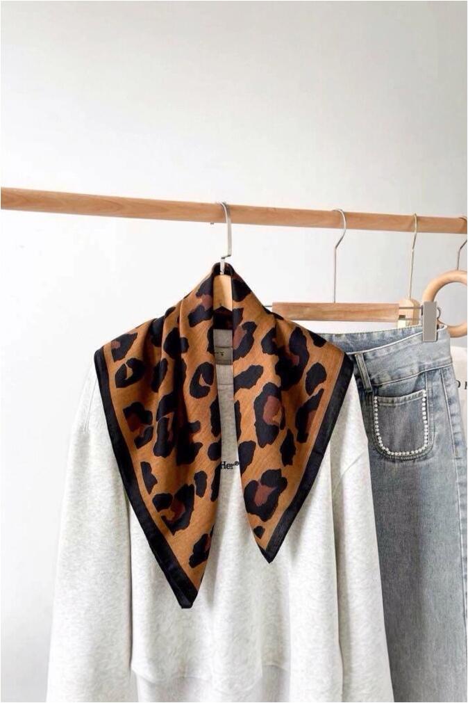 Pynt hodet, halsen, veska, eller bruk som belte. Firkantet skjerf i leopardmønster med sort kant. Pynter opp der du trenger det.