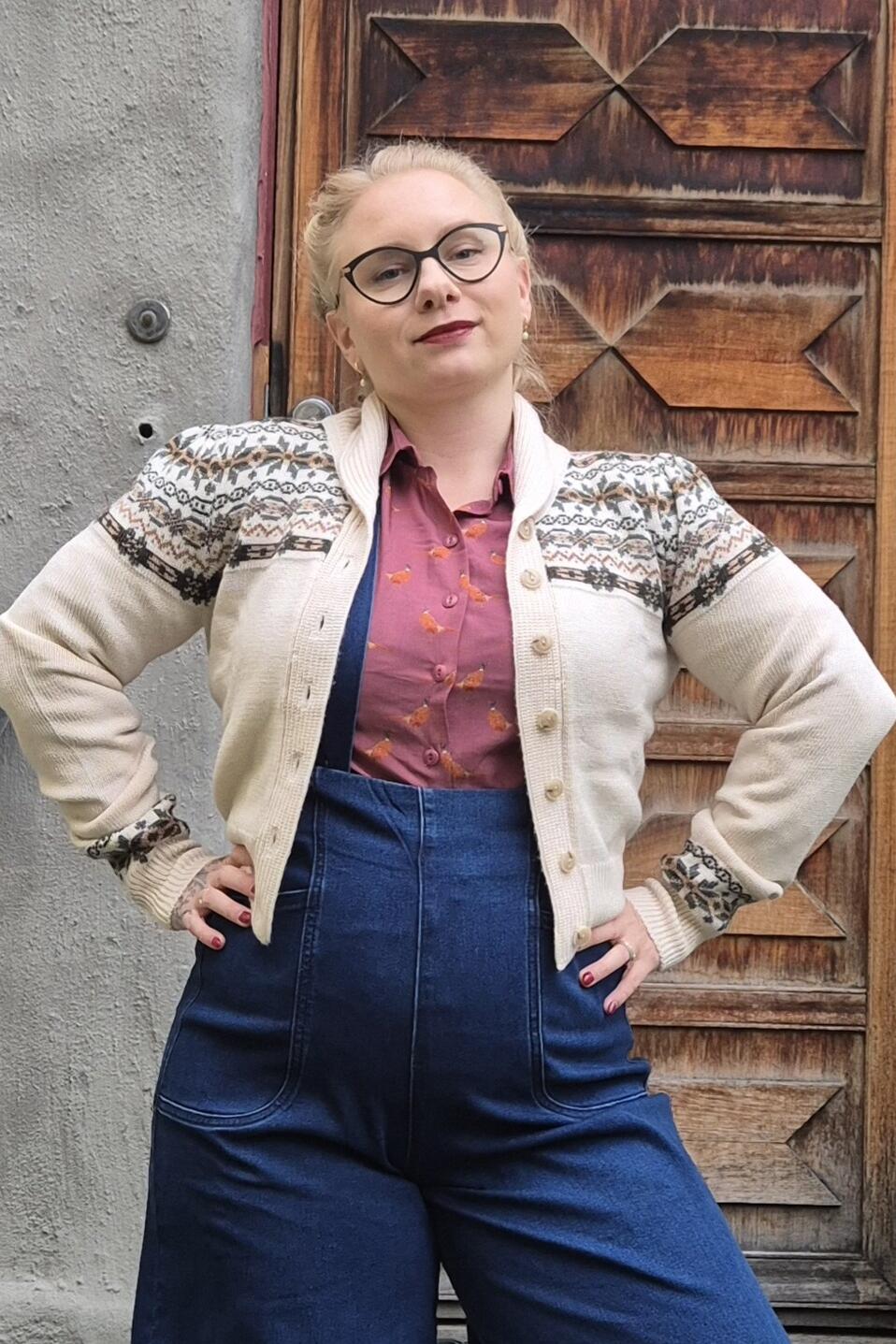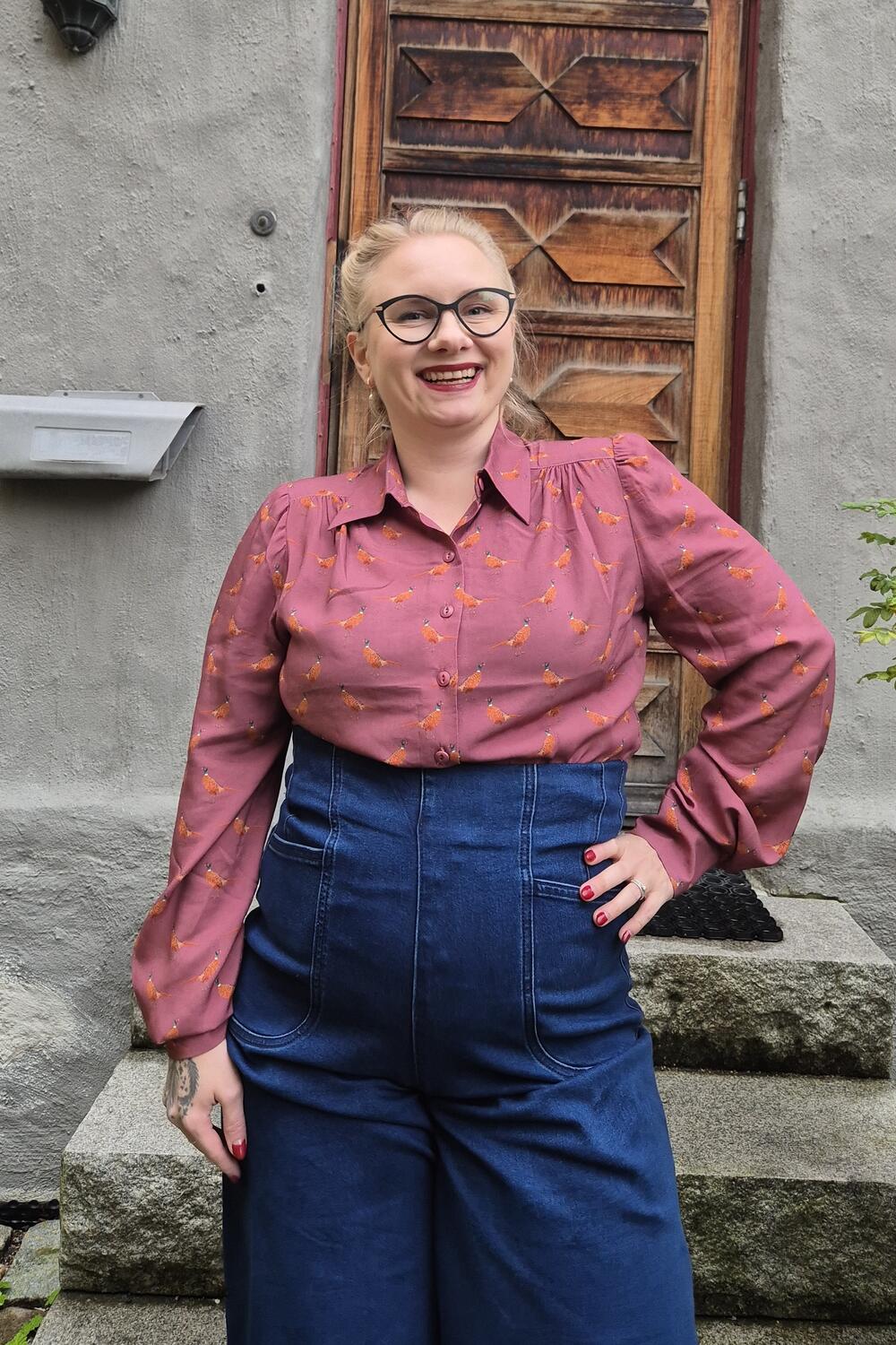 Nydelig bluse med superlekkert mønster av fasaner i oransje toner. Blusen har en nydelig dempet bringebær farge. Spiss krage som er perfekt å pynte med et slips eller et skjerf med brosje kanskje? Sømdetaljer, innsvinget midje og lange ermer med brede mansjetter. Lekre knapper i caruzonøtt.