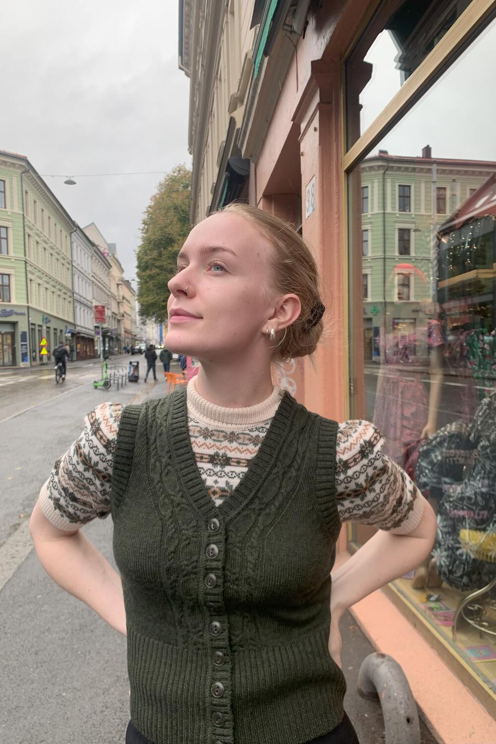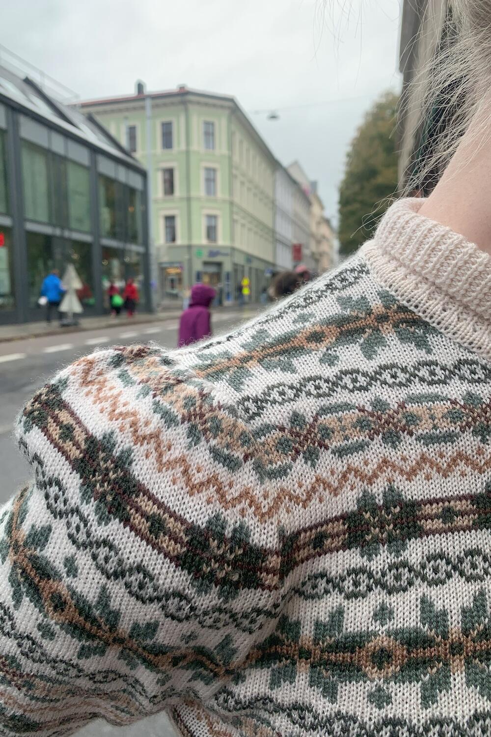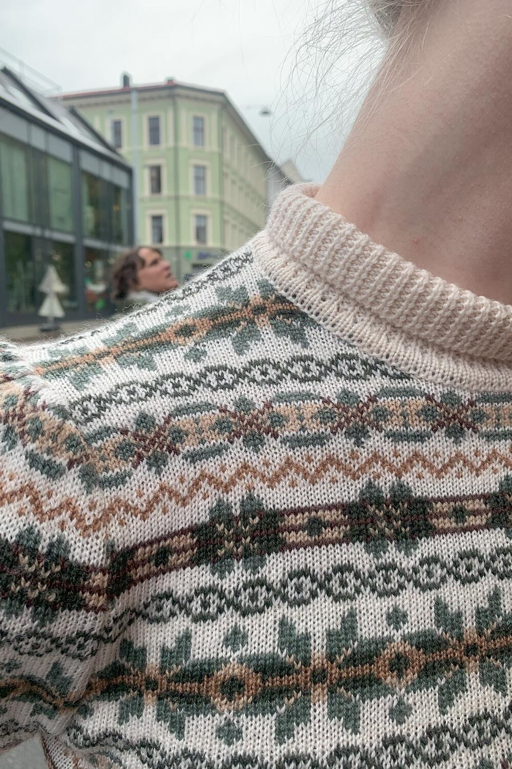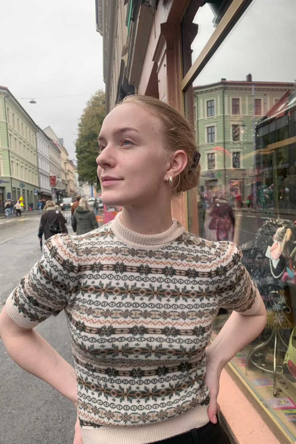 Nydelig strikket topp i Fair Isle mønster med rund hals og korte ermer. Tettstrikket mønster gir en god og varm topp. Rund, myk hals med knapp i siden. Brede ribbestrikket hem. Toppen er nydelig som den er, men kan kombineres med Ice Skater eller Fair Isle cardigan, og kan brukes både utenpå eller inni plagg.