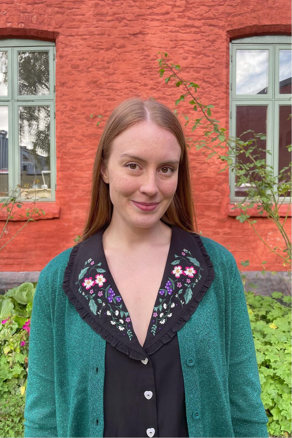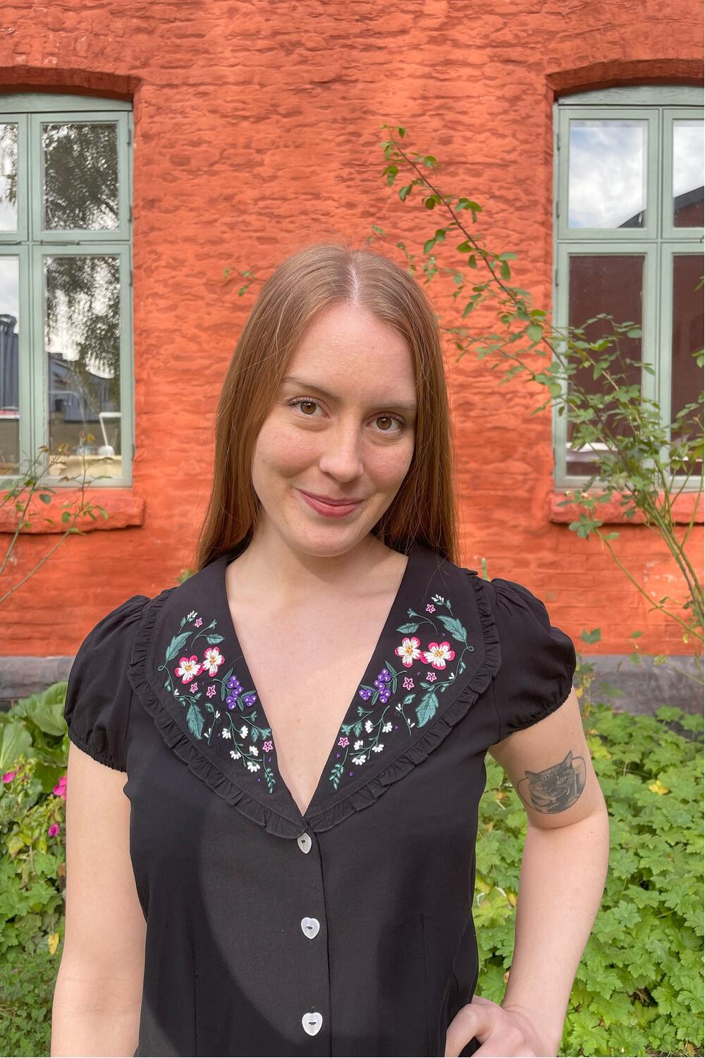 Supersøt bluse med en dyp v-hals. Kragen er dekorert med broderte blomster. Blusen har korte puffermer med elastiske kanter for komfort. Kneppes hele veien foran med de søteste hvite hjerteknappene.