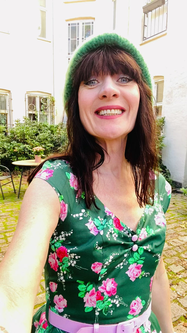 Dyp grønn bunn pyntet med rosa og røde roser. Raglan-ermer som akkurat dekker skuldrene og en dyp v-hals med rosa pynteknapper. V-rygg også. Beltestropper med et rosa belte. Også - flyter det ut til et skjørt med masse vidde. Skjulte lommer i sidene. Glidelås i ryggen.