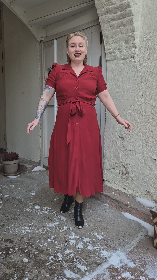 Shirtwaister sydd etter et autentisk mønter fra 1940. I en herlig portvinsrød farge. Her ser du først vår butikkvixen Line i den. Hun er 158 cm høy, og ser fabelaktig ut. Om du f.eks er 170 cm høy vil du også dekke knærne godt.
