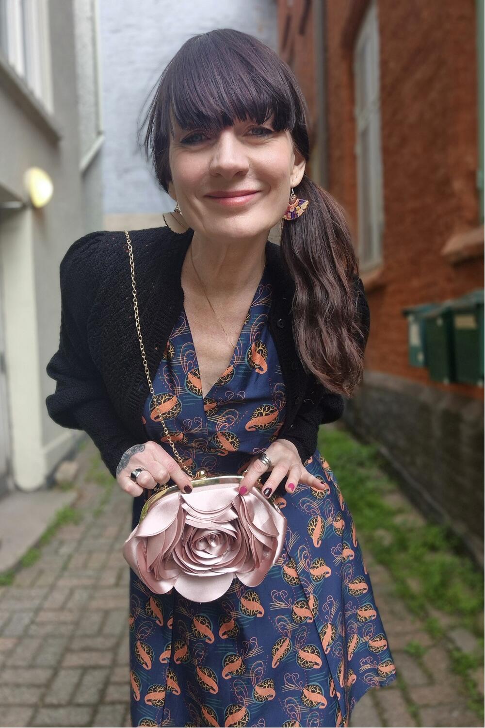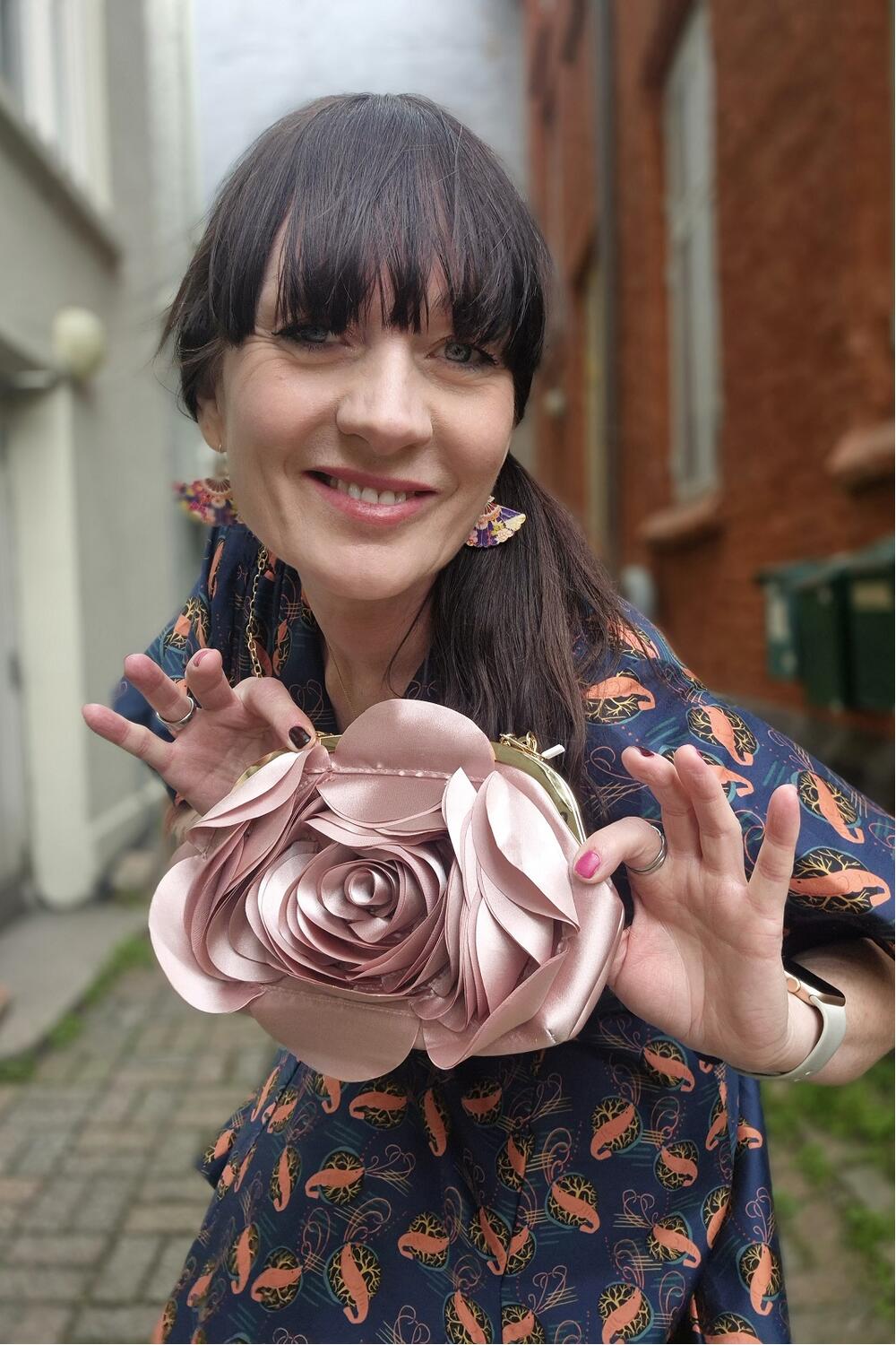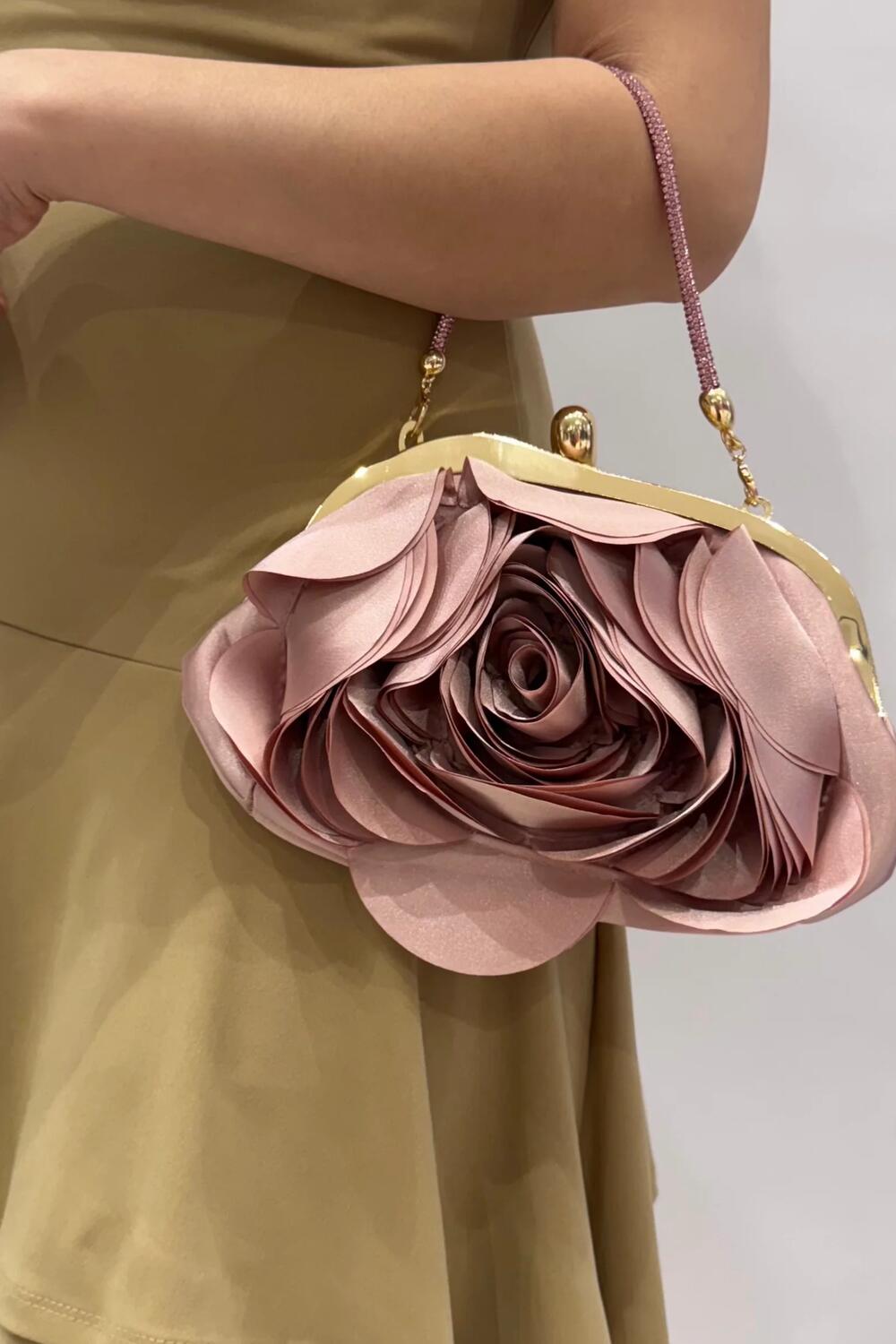 Nydelig, blekrosa clutch/håndveske formet som en rose. Har gullramme og gullås. Kommer med et mykt, avtagbart håndtak og har plass til det du trenger (mobil, sminke osv).