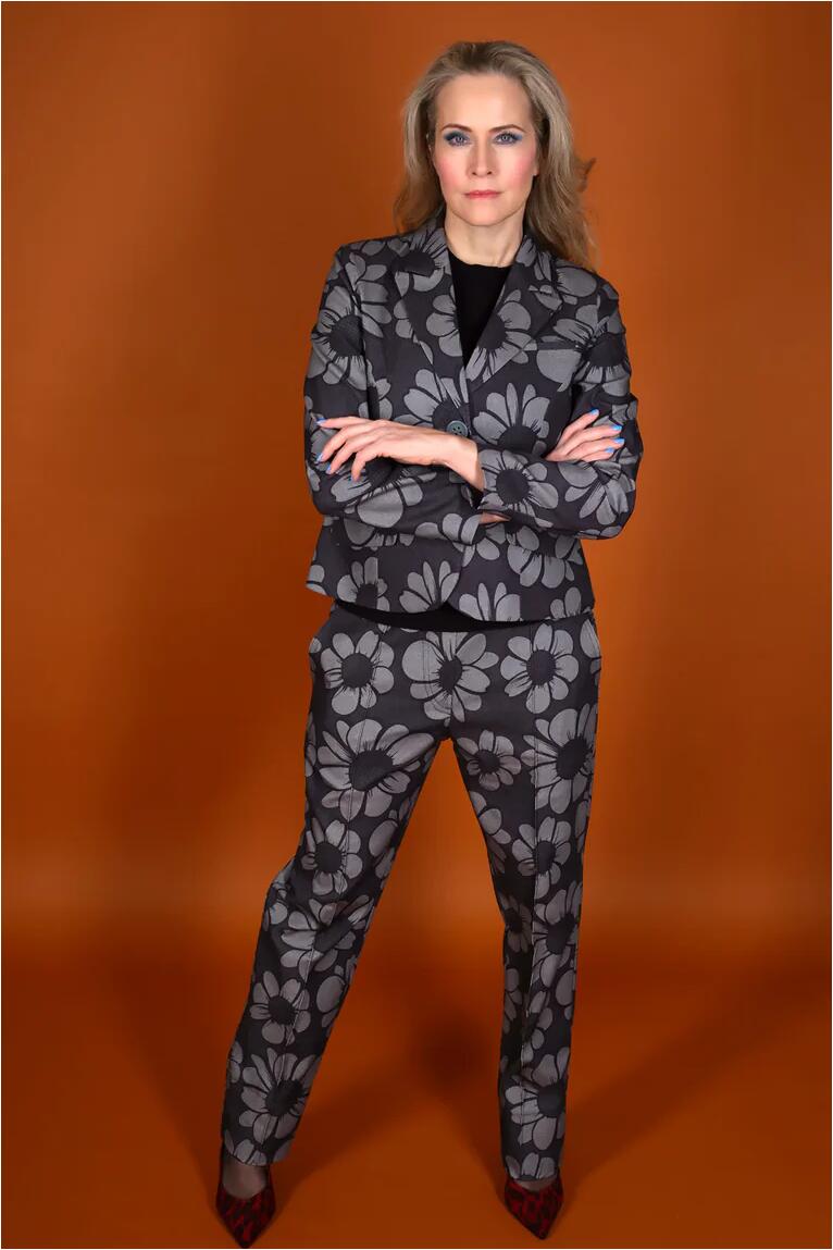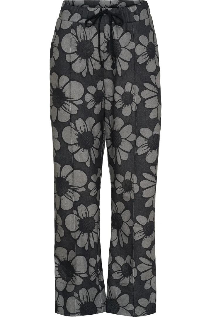 Bukser med store blomster på stretch denim, totalt komfortabel med mulighet for å dresse opp og ned. De er i den klassiske fargekombo sort og grå. Buksene har elastisk midje med sort knytebånd og lommer.