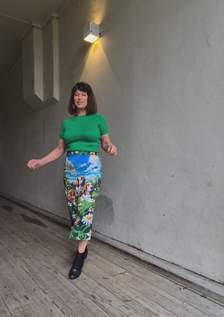 Darlingtoppen er en deilig strikket topp i fargen jelly green som du kan bruke til alle dine bukser og skjørt. Den er tettsittende, men med masse stretch og har rund hals og korte ermer. Med et nydelig hjerte-hullmønster, og ribbestrikk på ermer og hals.