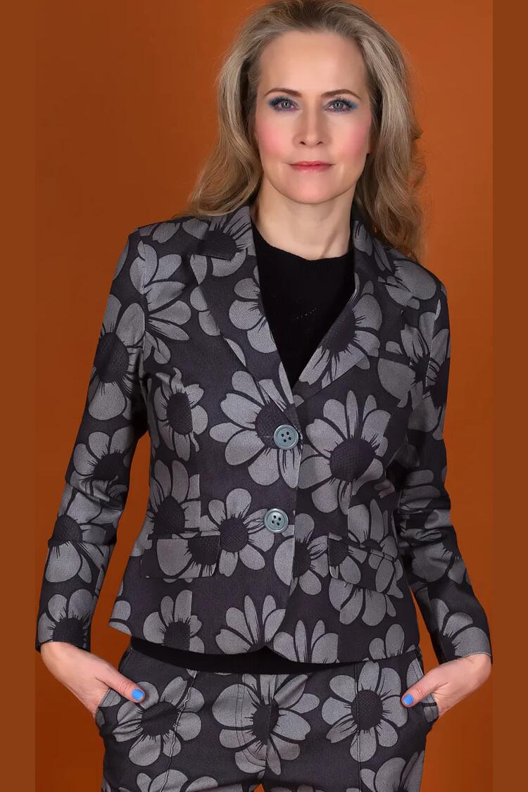 A garden made of steel. Gobsmacked er en stilren enkelt-spent og figursydd blazer med spiss krage og lett skulderpute. Blazeren er lavet i et skjønt gråsort cowboyprint med blomster på bomulds denim og har sort for.