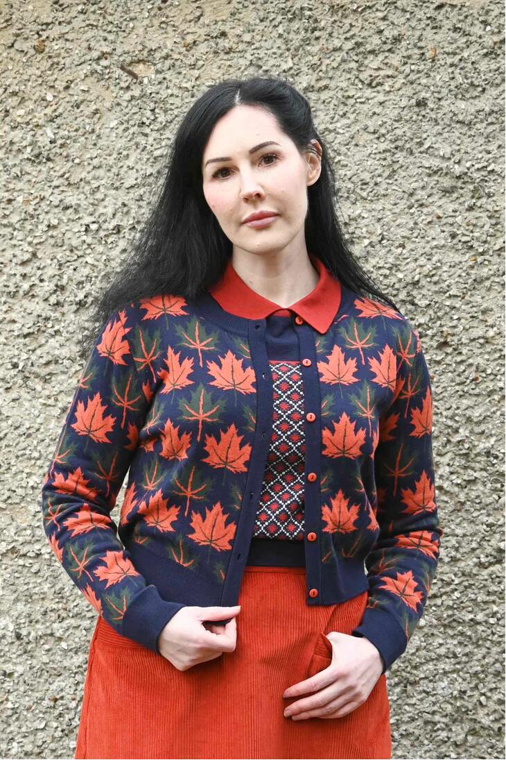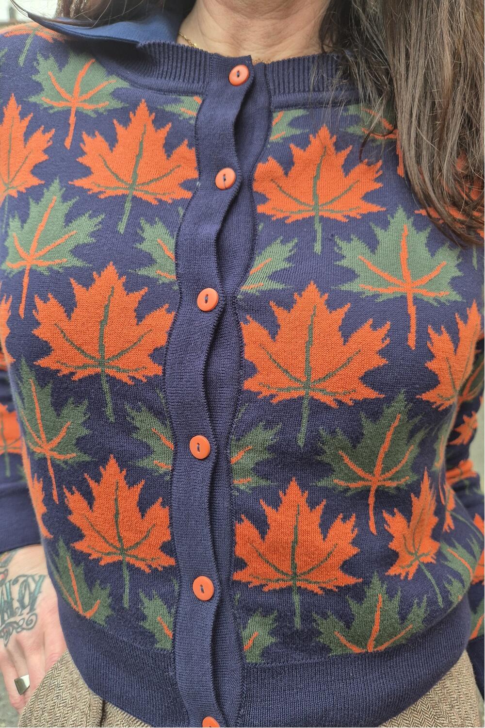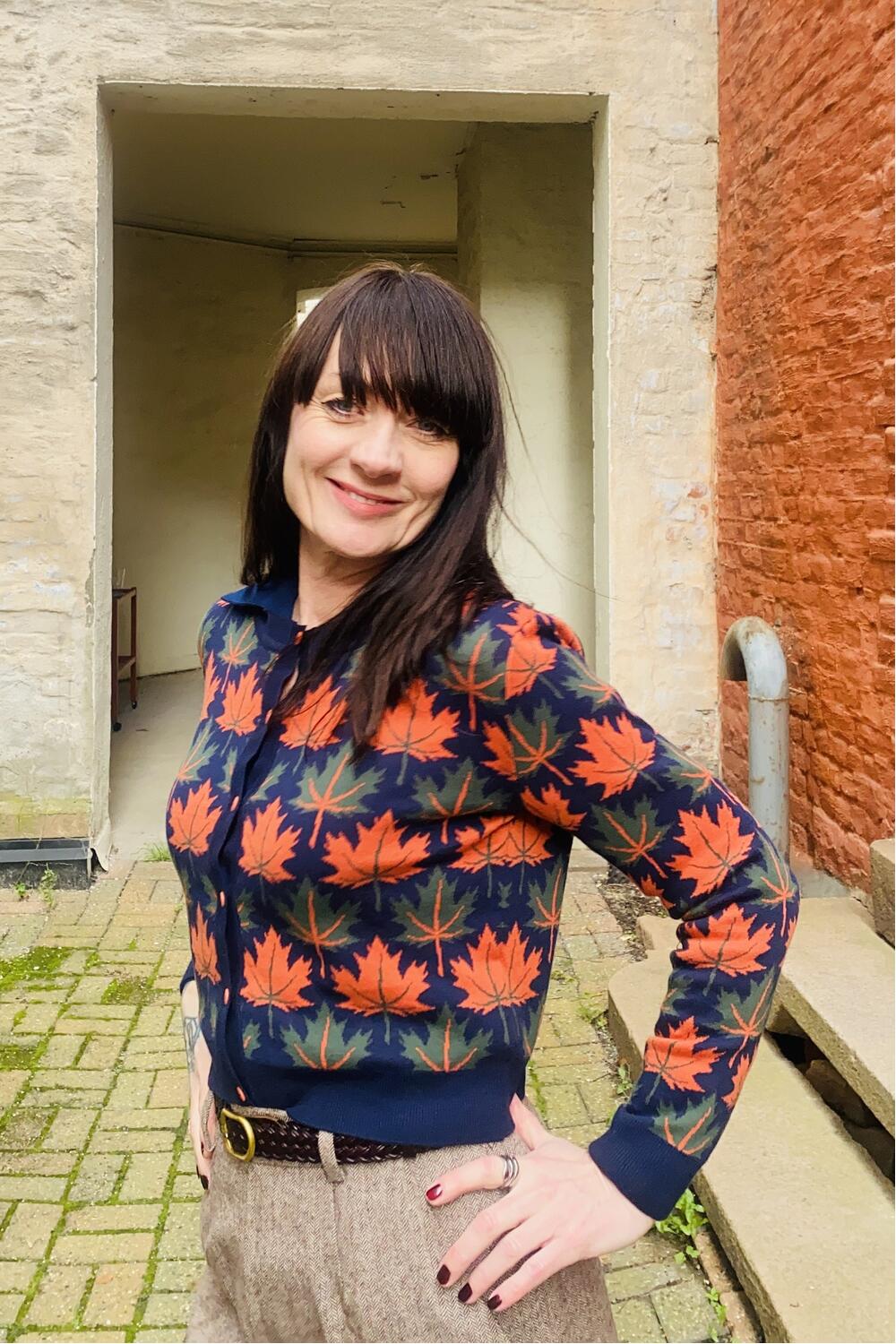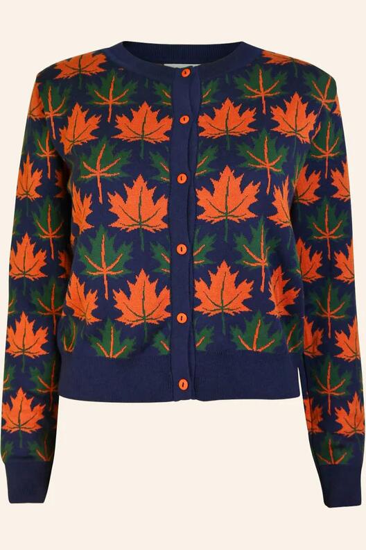 Etisk produsert, elegant og vintageinspirert cardigan i myk bomull. Vera har en dyp blå bunn, med et herlig strikket mønster av høstblader. Hun er god og varm for høst og vinter og er perfekt til alle dine kjoler, men Edith kulottene spesielt.