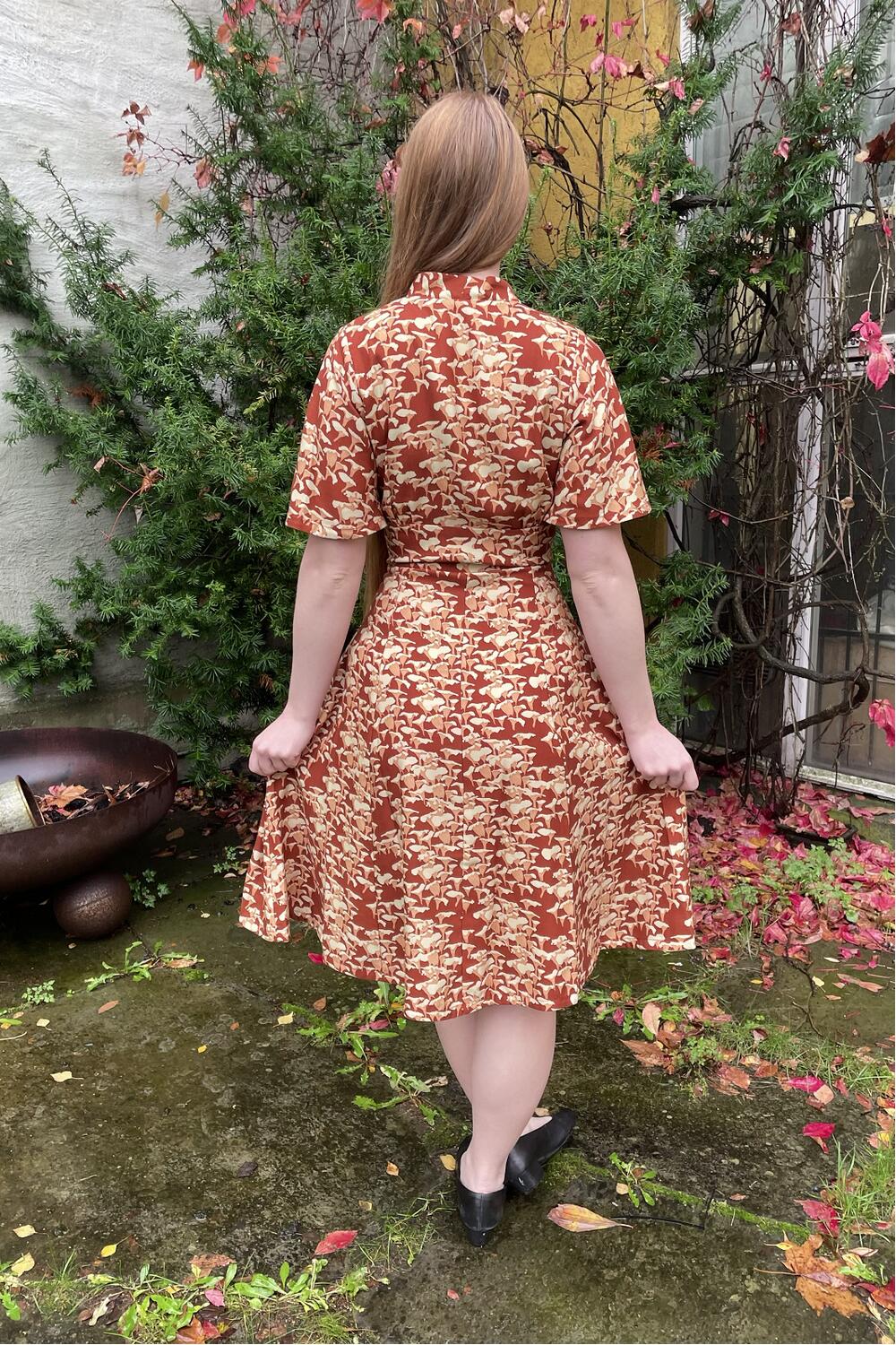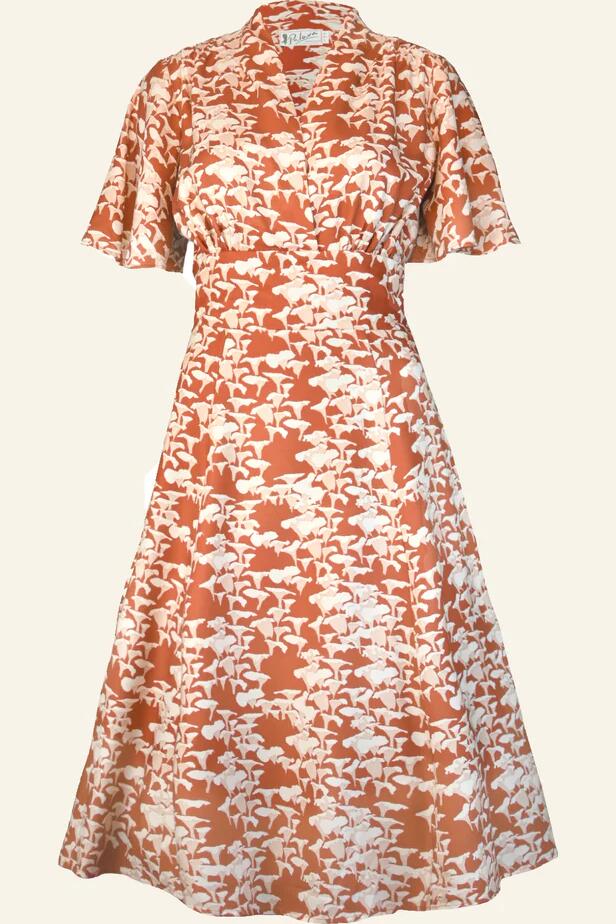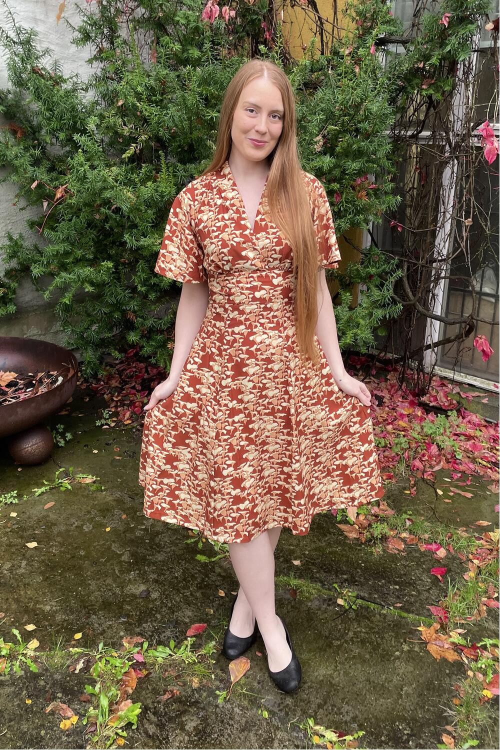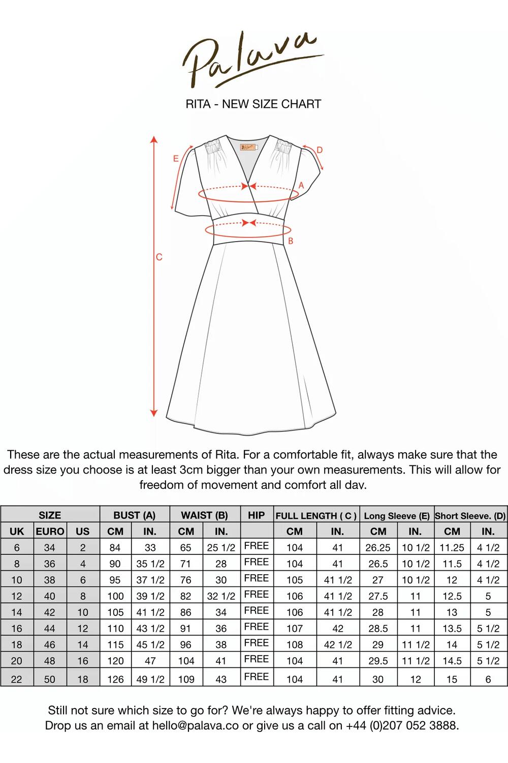 Kjolen har dyp v-hals. Tett passform over midjen, og et skjørt som har god vidde. Lommer i sidene og en skjult glidelås i siden. Rita er litt liten i størrelsen (se eget bilde med nye mål). Bysten er dyp v, med god plass.
