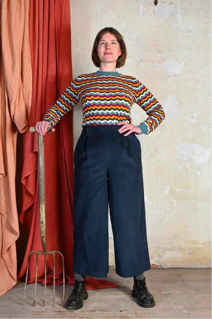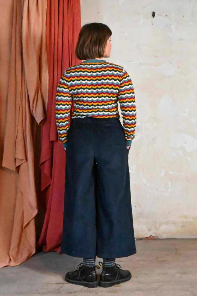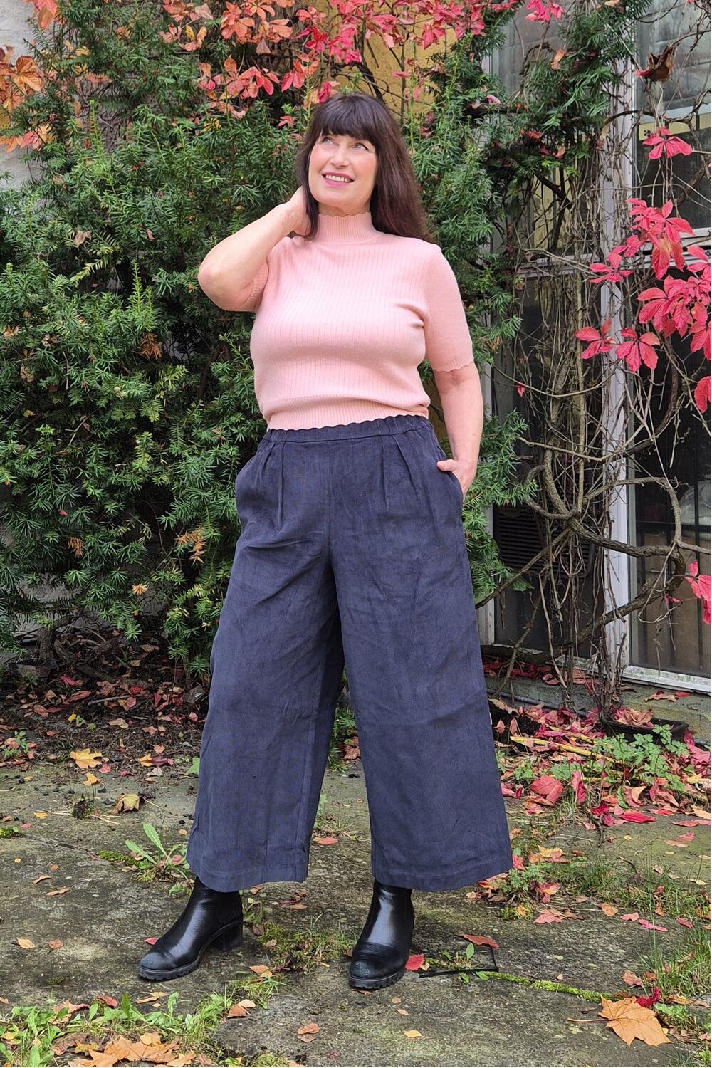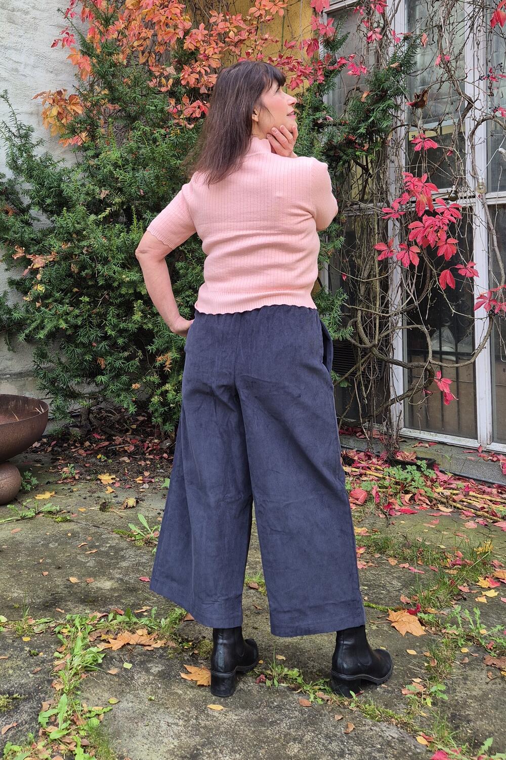 Edith er en deilig kulott-bukse i myk og god kordfløyel. Vi bare digger kulottene til Palava, de er så komfortable på. Fargen er mer gråblå enn petrol, en nydelig farge som passer så mye av høstfargene. Perfekt lengde på beina om du er lang eller kort. Flat midje og elastisk i ryggen, så du har komfort hele dagen, og lommer i sidene.