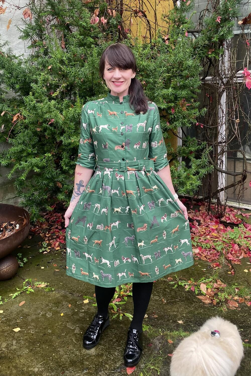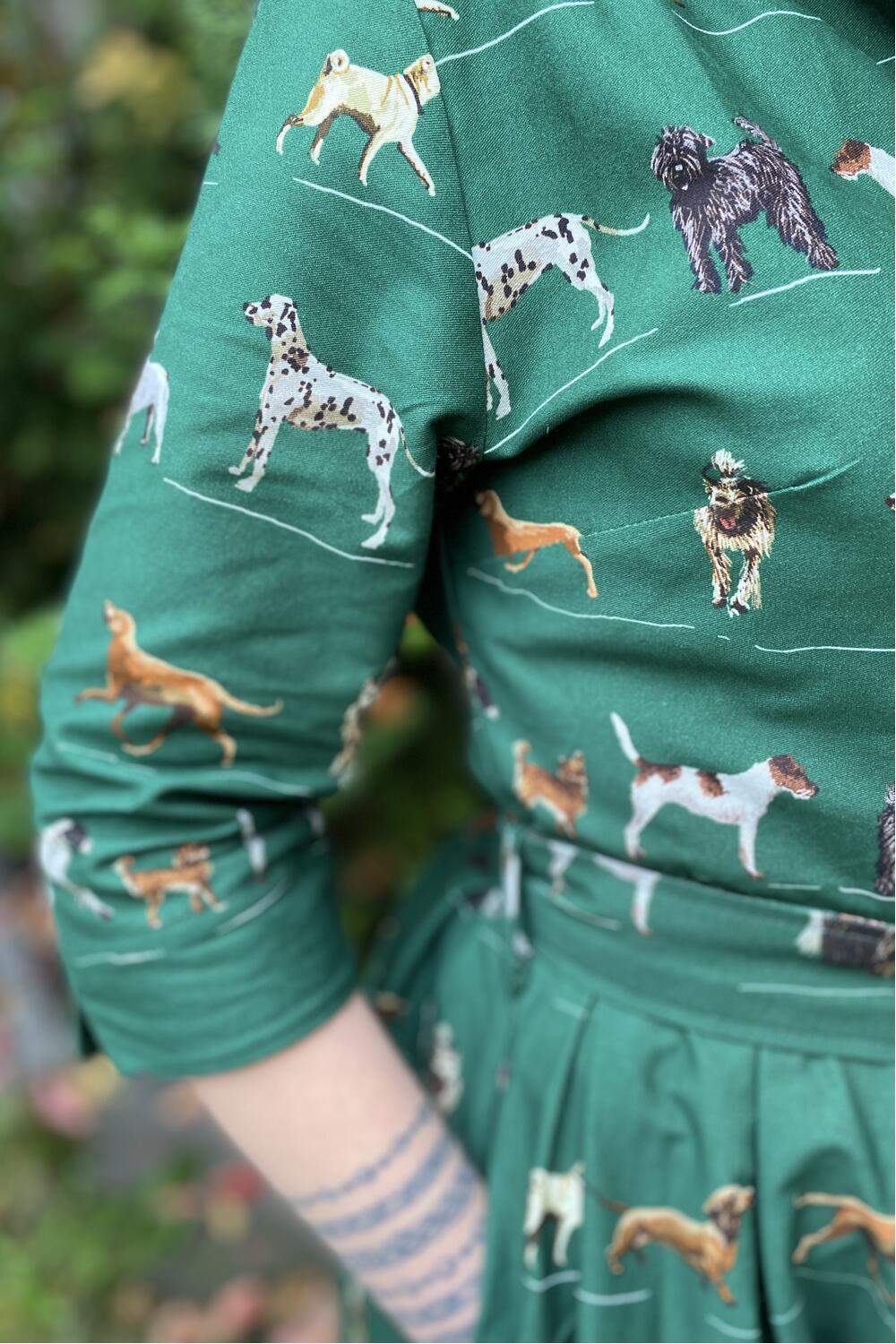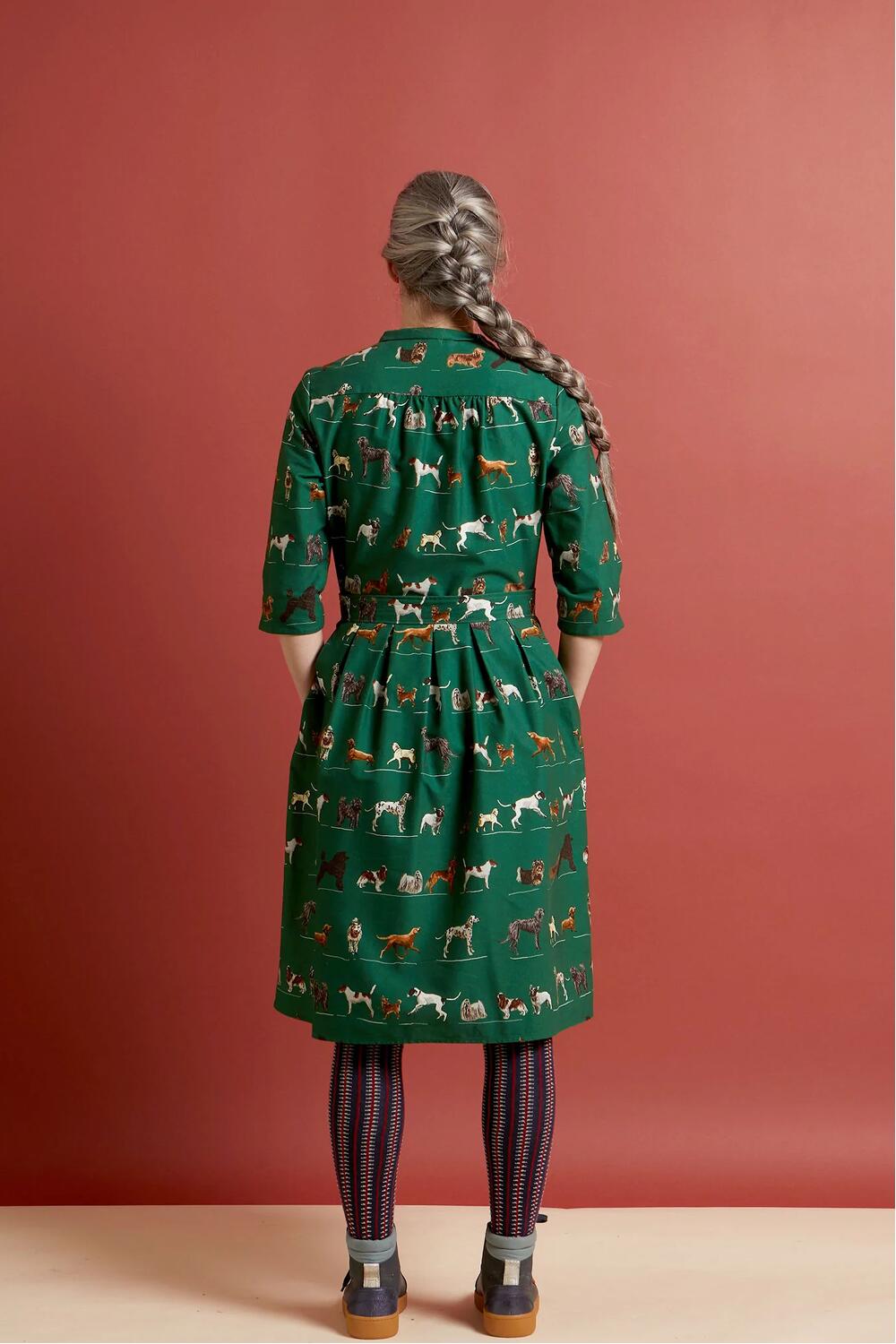 Fantastisk kjole med glade hunder på grønn bunn.
