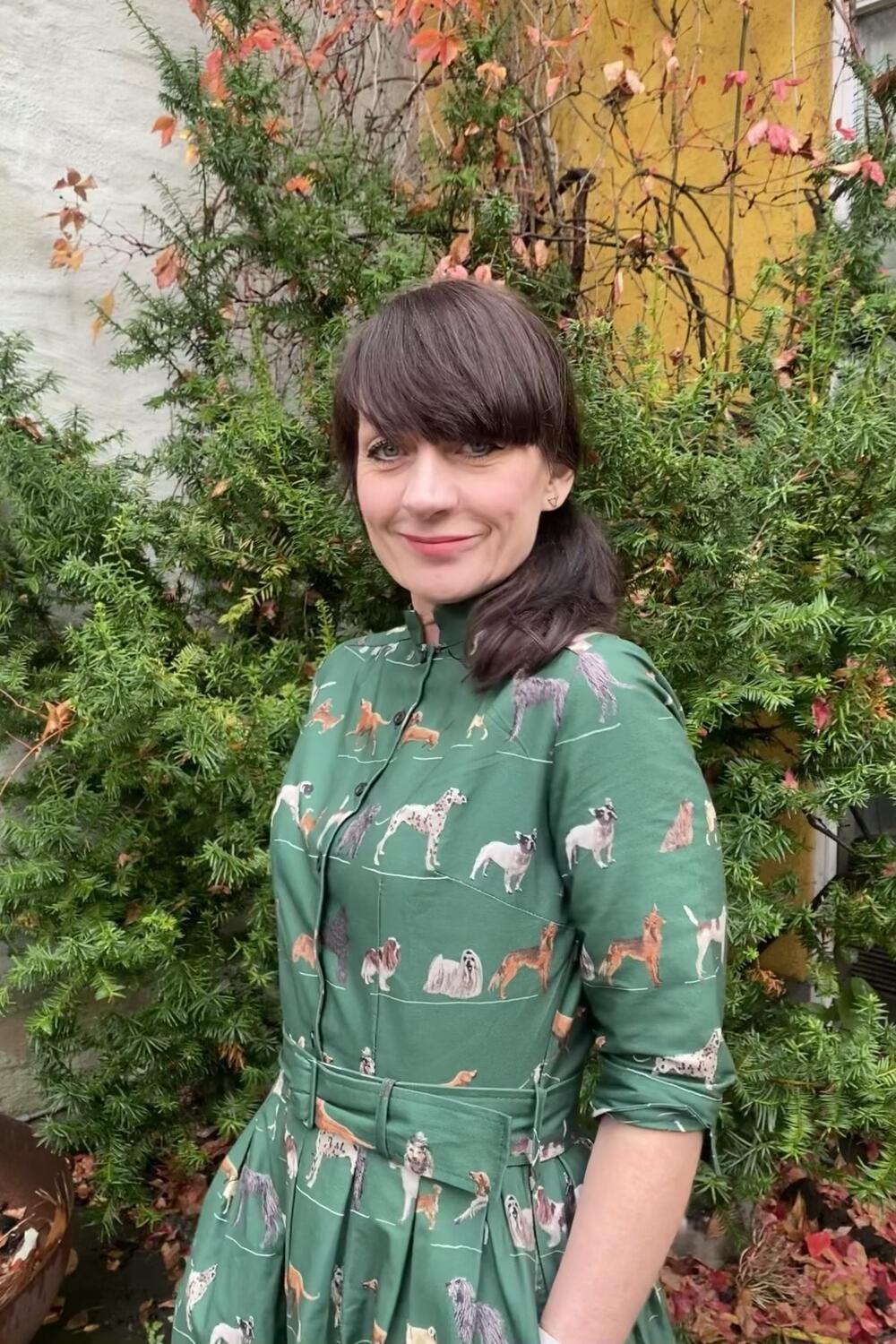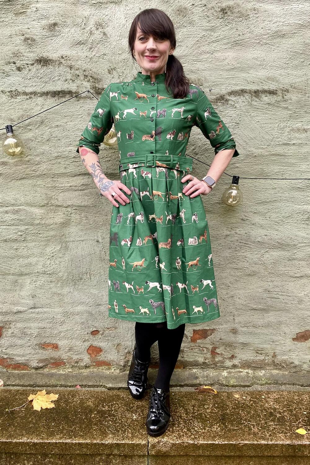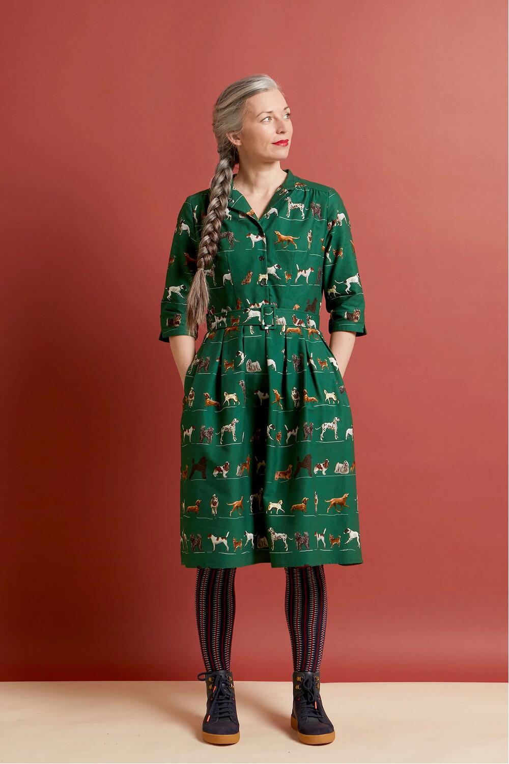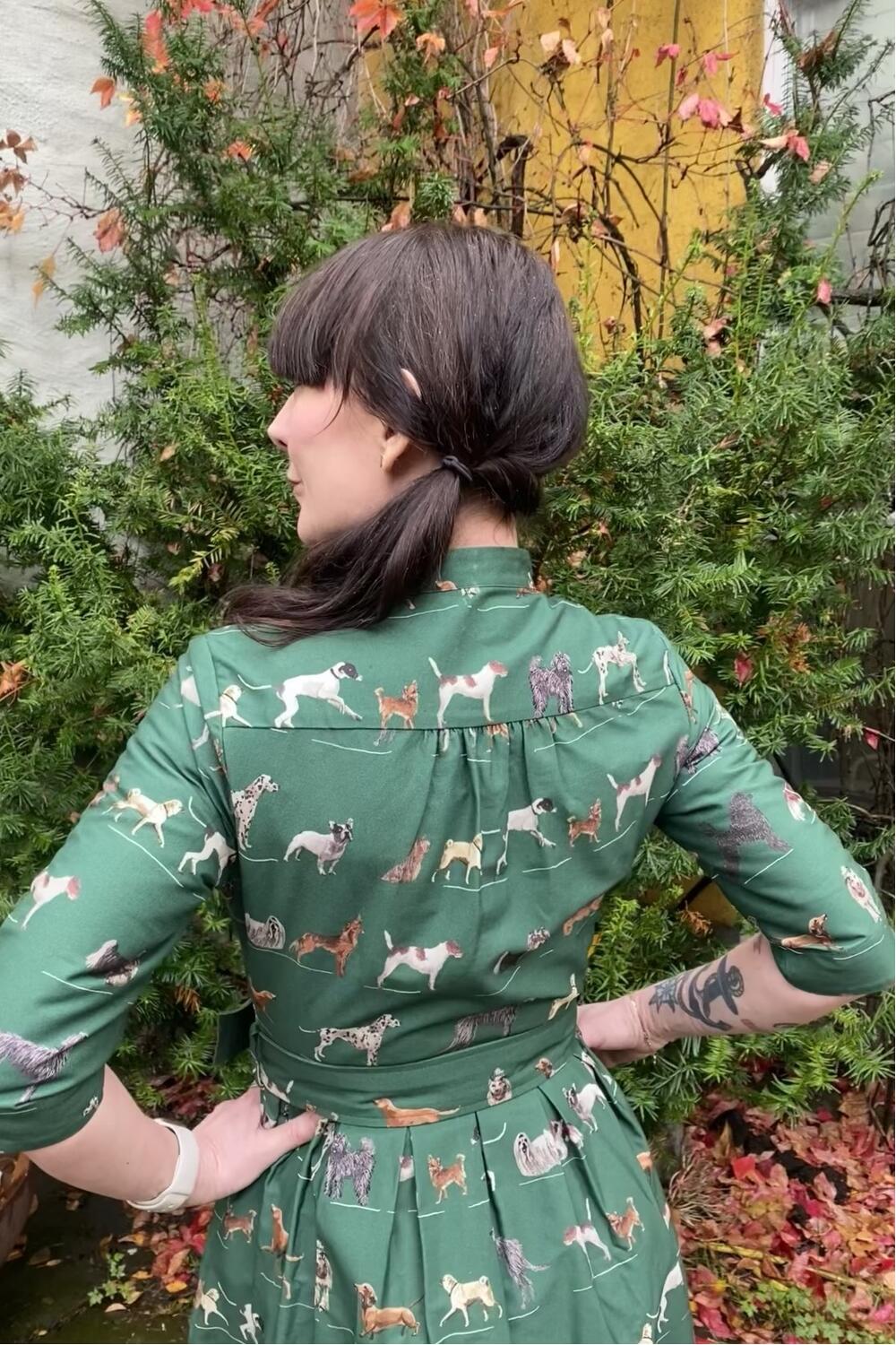 Fantastisk kjole med glade hunder på grønn bunn.
