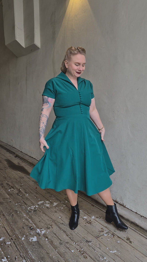 Denne vakre smaragdgrønne kjolen kommer full av 40-talls inspirasjon. En elegant hverdags- eller festkjole som gir deg oppmerksomhet! Se så fint det er kombinert med strømper med søm. Pynt kjolen med en brosje og et belte om du vil.