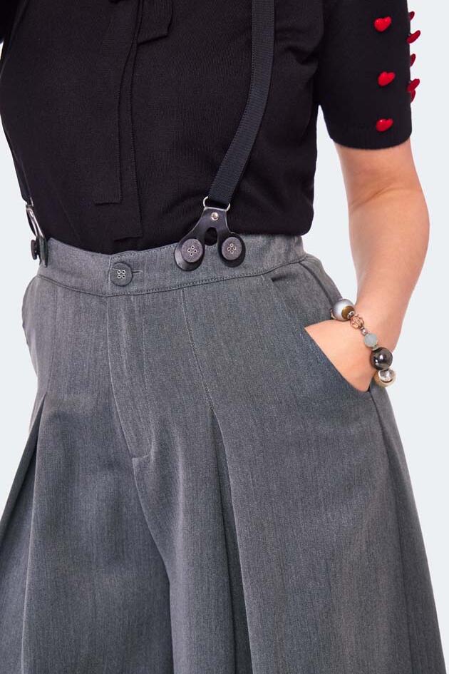 Høye i livet (og høye på livet) med avtagbare bukseseler. Lommer i sidene og herlige sømmer som skaper liv! Glidelås og knapp foran.