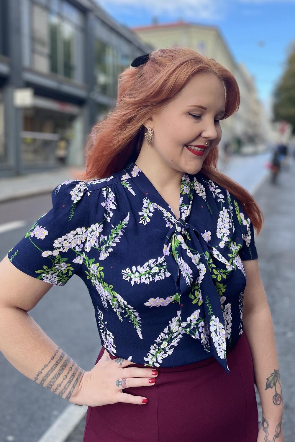 Tilfør litt vintage eleganse til antrekket ditt med denne vakre blusen. Printet er blåregnsplanten, og det har Weekend Doll tegnet selv. Se etter et lite hjerte i printet. Det er kjennetegnet til designer Yuriko.