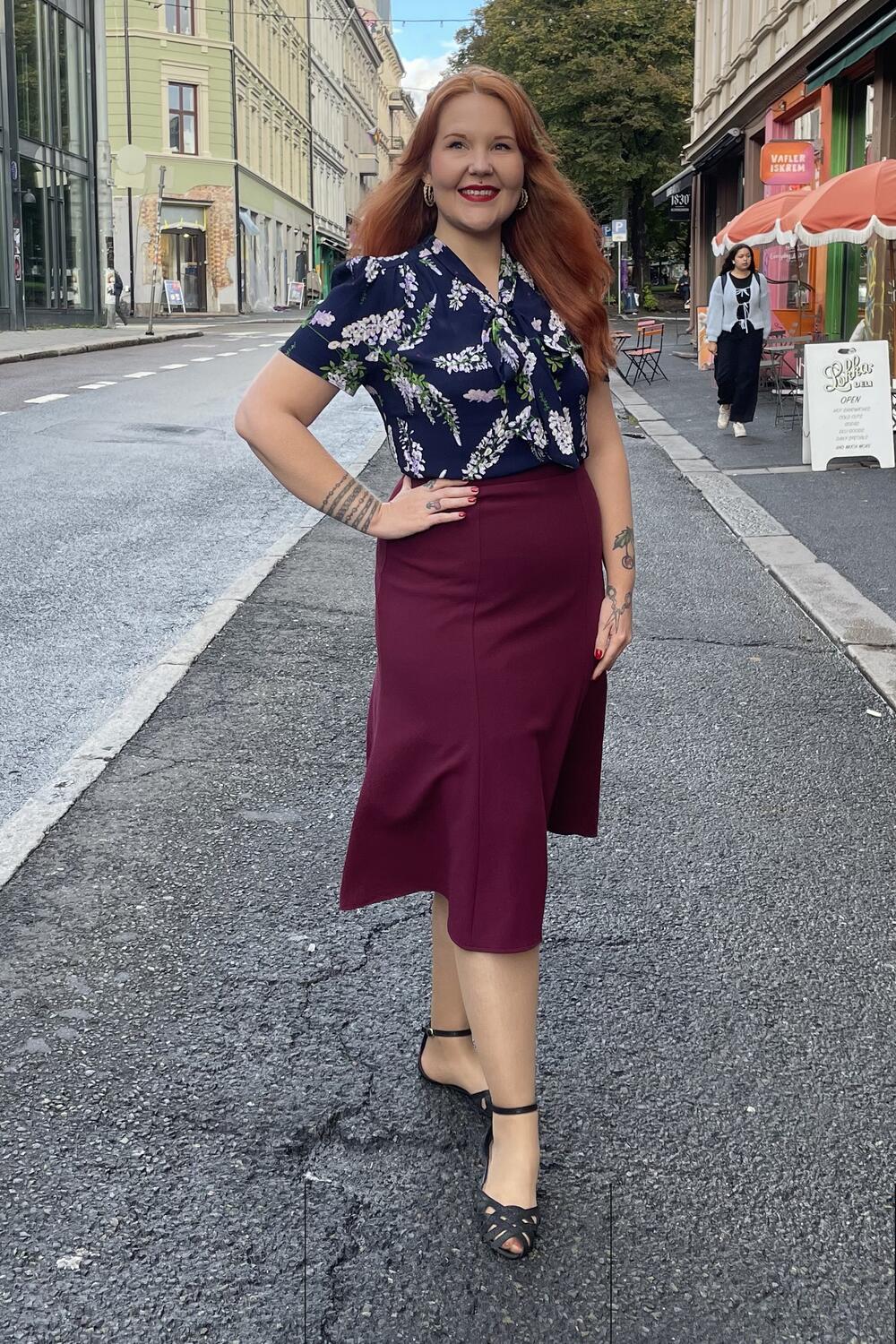 Ingrid er en luftig bluse du bare tar over hodet, så ingen glidelås eller knapper. Blusen har luftige ermer med lett puff på skuldrene og en sløyfe du knyter i halsen. Kan brukes inni bukser og skjørt, og utenpå også selvfølgelig.