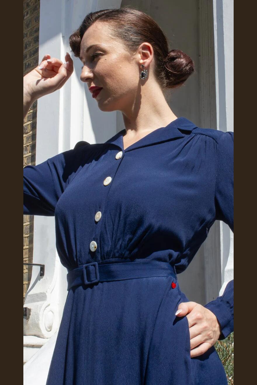 Claire er en tidløs, 1940-talls inspirert skjortekjole med dobbel krage, lange ballongermer med puff på skuldrene, og 2 knapper i mansjettene, så du kan justere lengden på ermene. Overdelen har lekre detaljer som plissering foran ved skuldrene og i ryggen, og pene sømmer ved bysten. Knappene er laget av skjell.